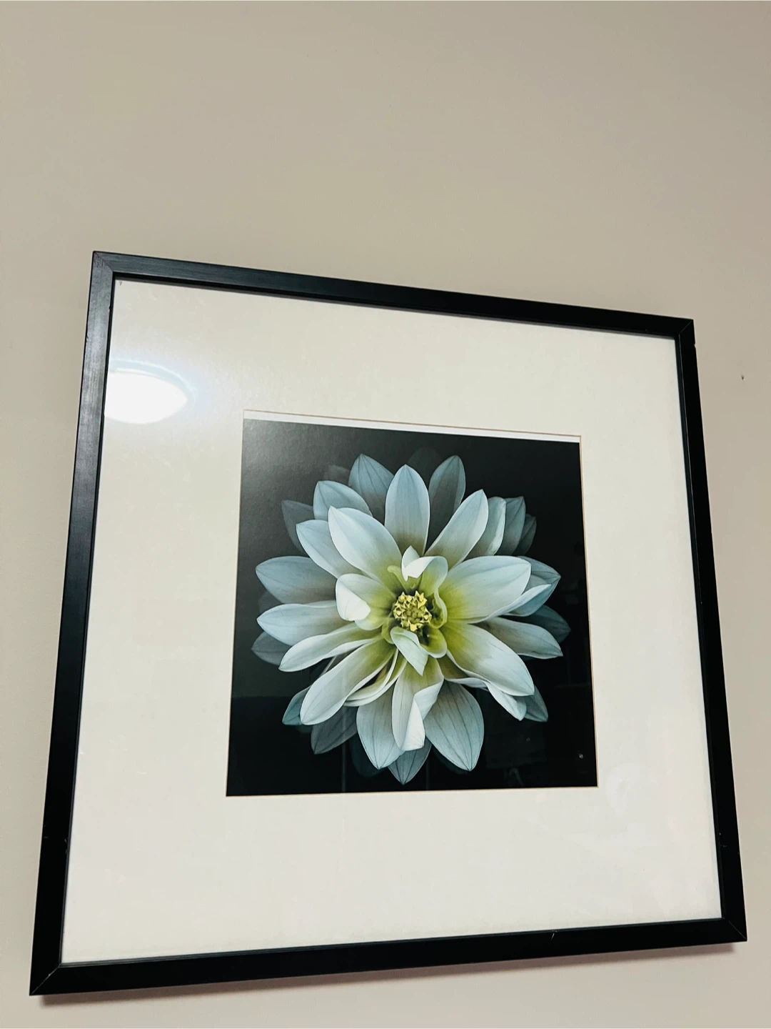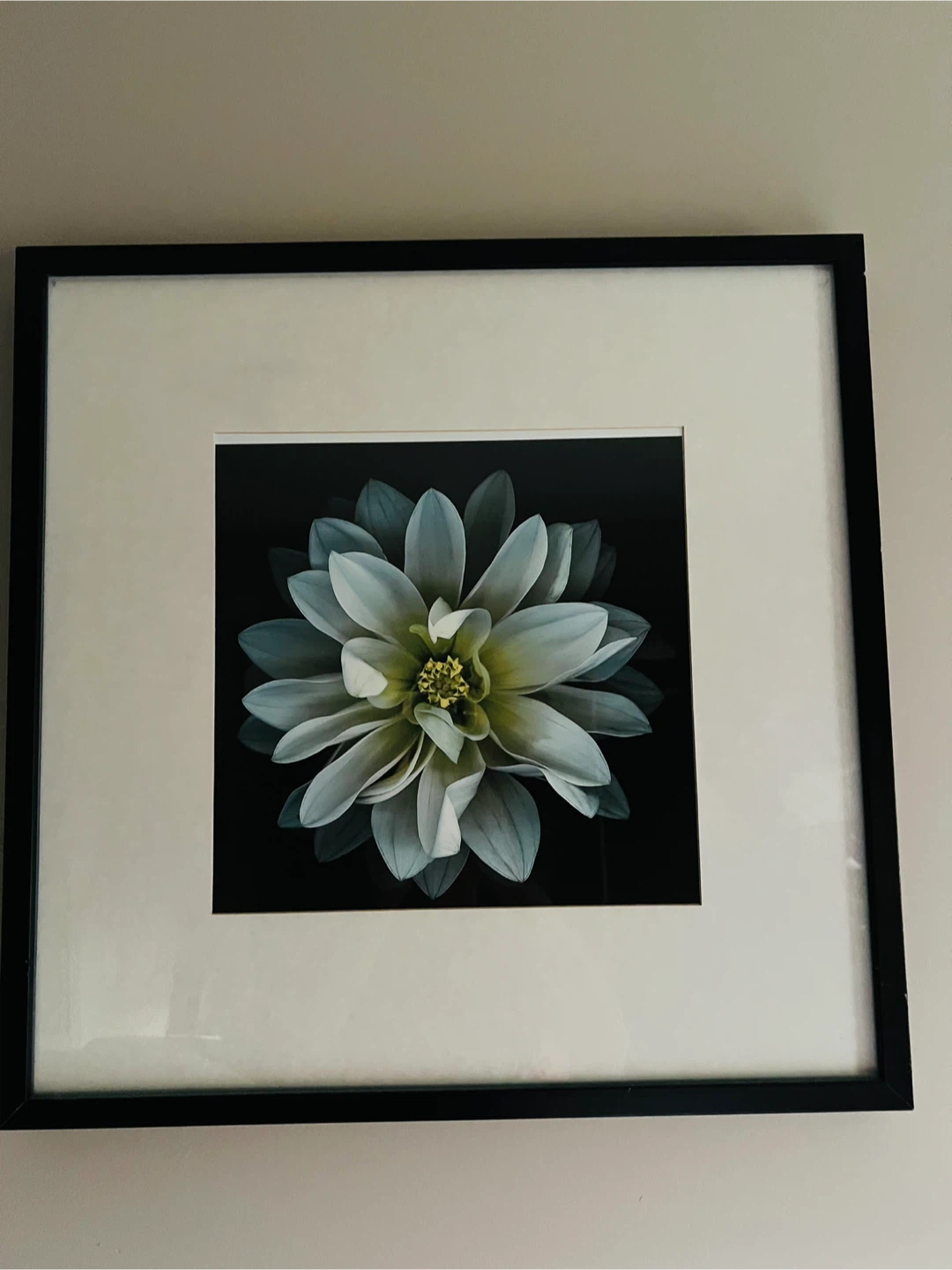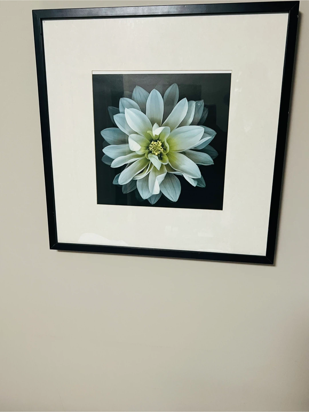 A lovely piece of wall art featuring a floral print with a black frame. It's in great condition and ready to add a touch of elegance to your home.