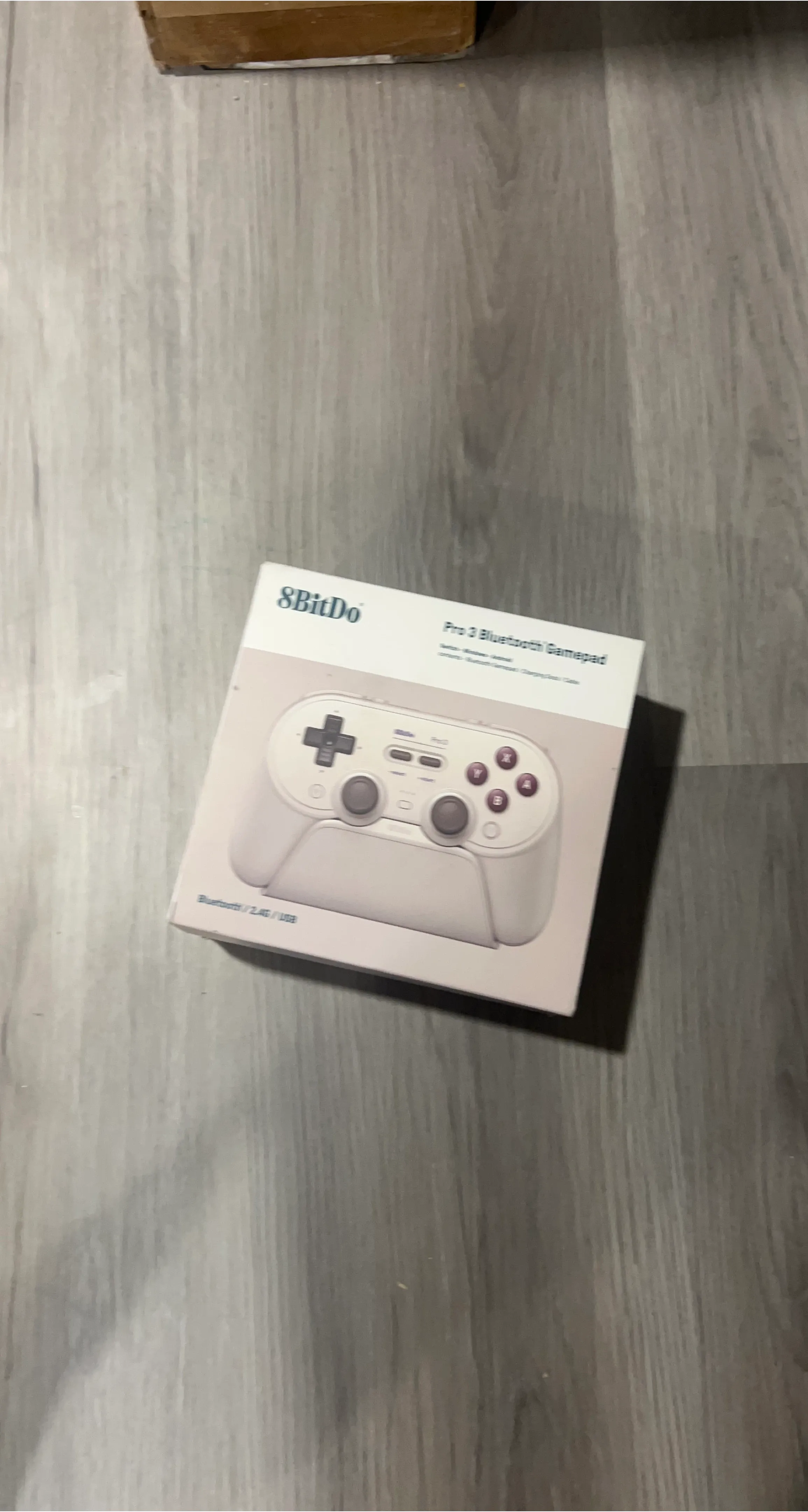 This is an 8BitDo Pro 2 Bluetooth Gamepad. It supports Bluetooth, 2.4G, and USB connections. This gamepad is white and includes its original box.