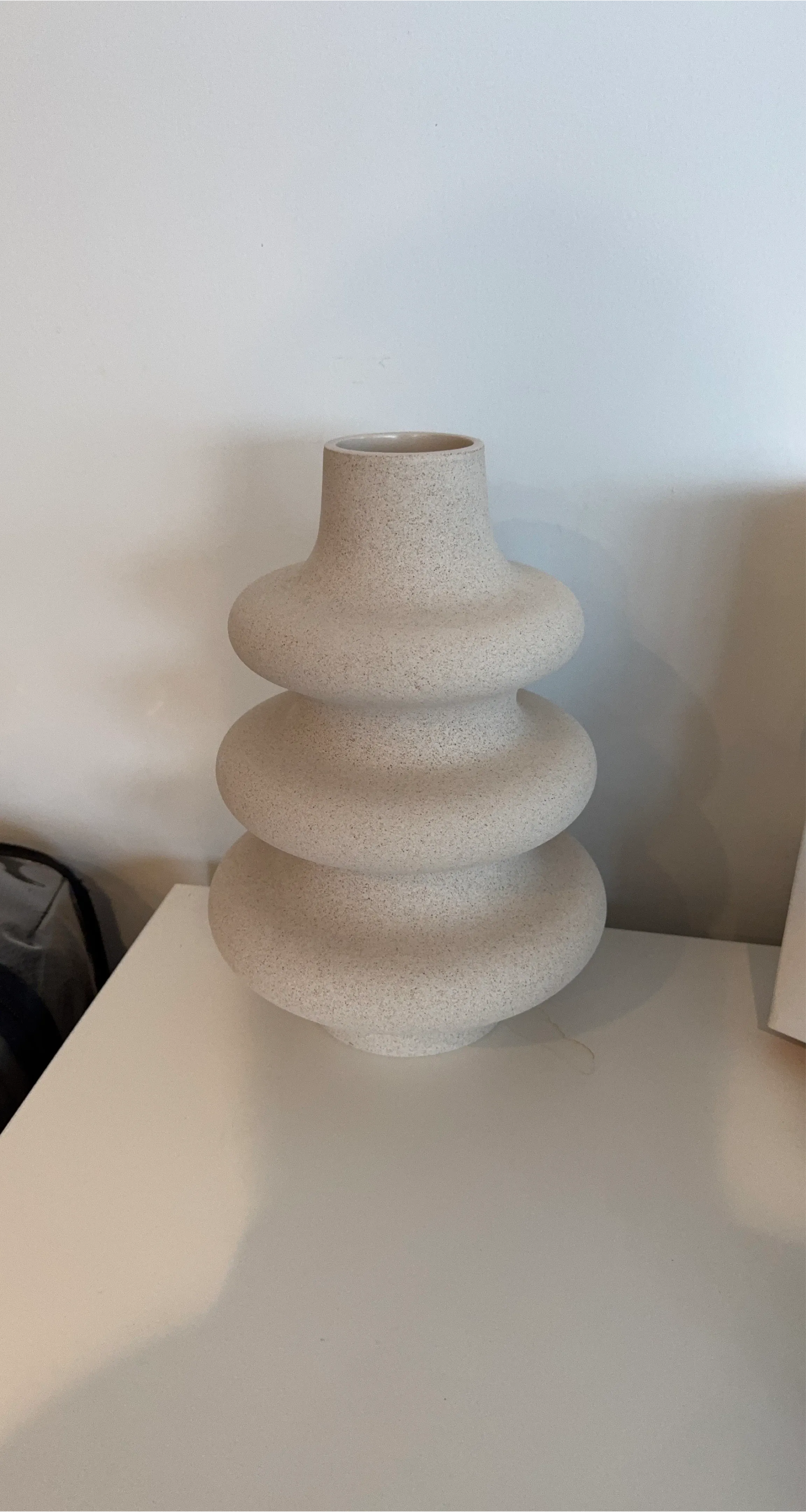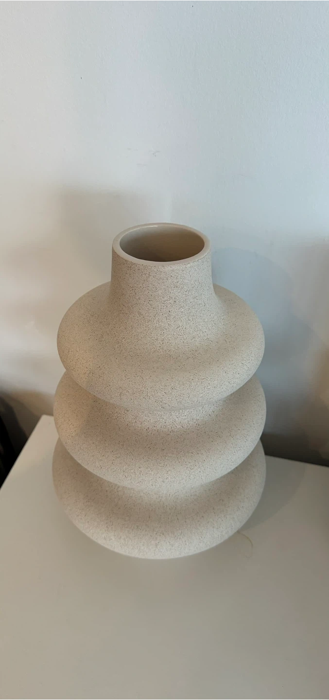 A stylish ceramic vase with a unique tiered, rounded design. It has a speckled matte finish in a neutral tone. Perfect for adding a modern touch to your decor.