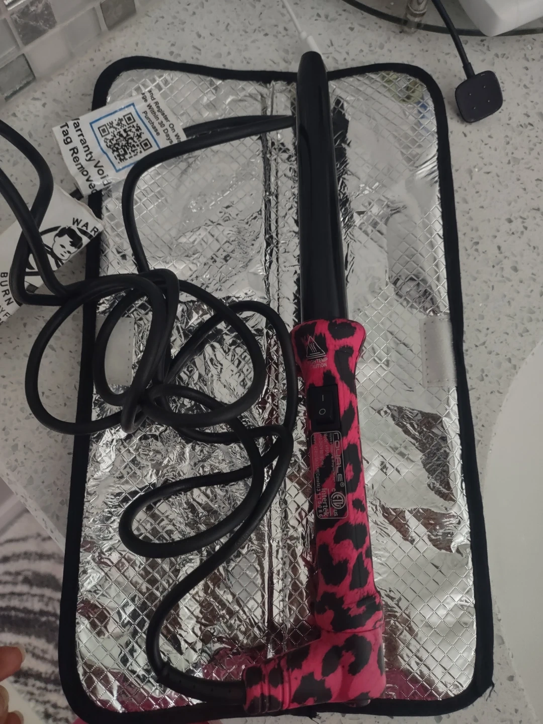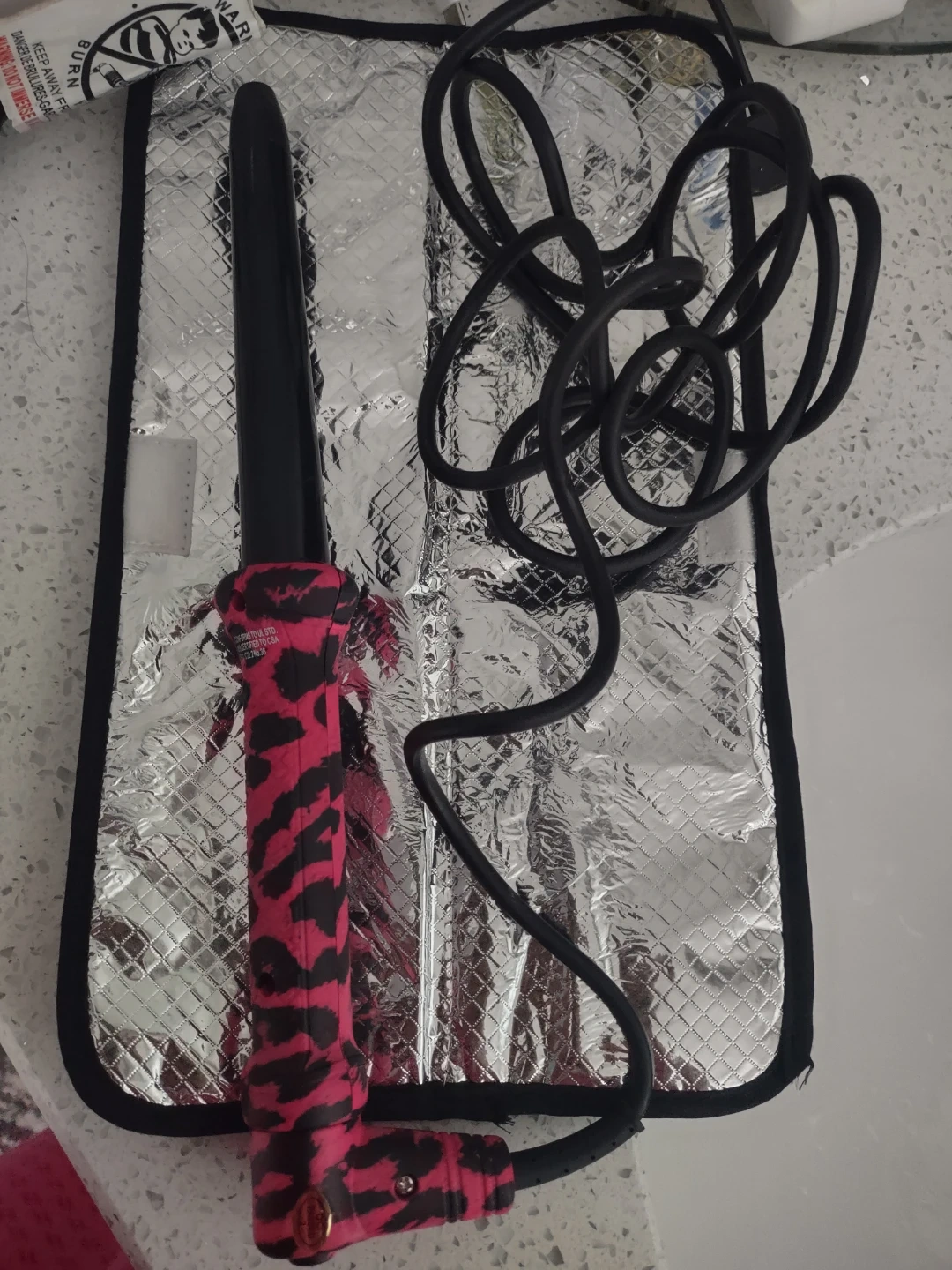 Selling a professional curling iron wand in excellent condition! It features a pink and black animal print design. It also comes with a heat resistant mat.
