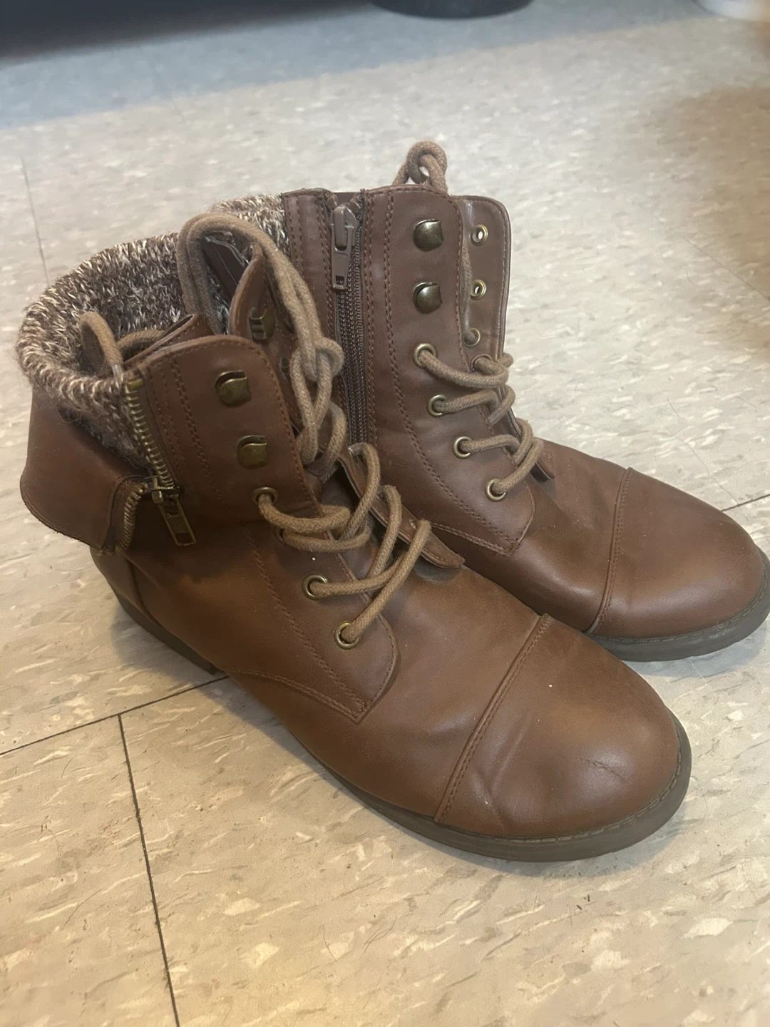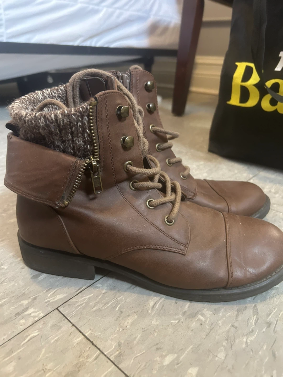 These stylish brown combat boots feature a cozy knit cuff and convenient side zippers. They're made from faux leather and are perfect for everyday wear. Comfortable and durable, they'll keep your feet warm and dry.