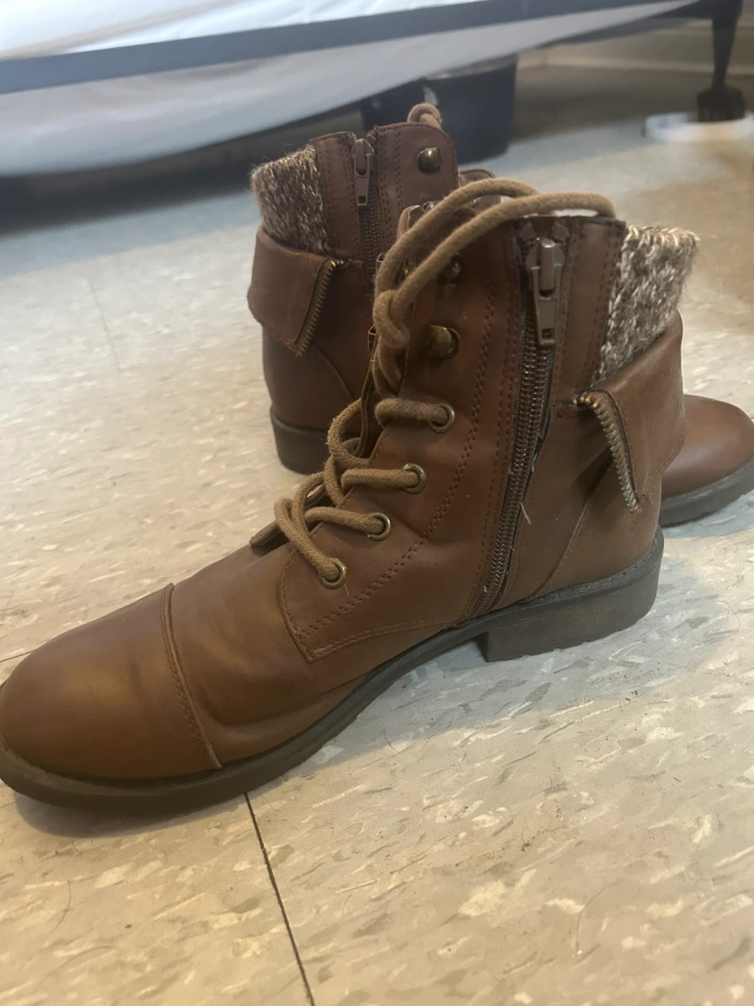 These stylish brown combat boots feature a cozy knit cuff and convenient side zippers. They're made from faux leather and are perfect for everyday wear. Comfortable and durable, they'll keep your feet warm and dry.