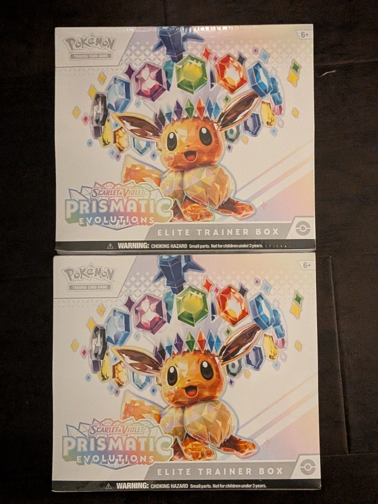 Selling Pokémon Scarlet & Violet Prismatic Evolutions Elite Trainer Boxes! These are brand new and ready for a new home. Great for players 6+!