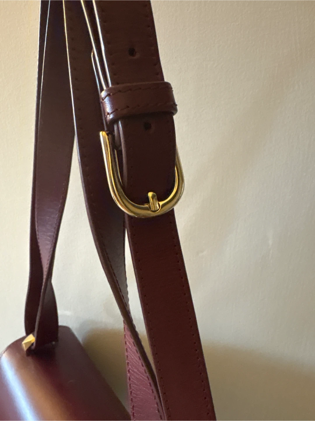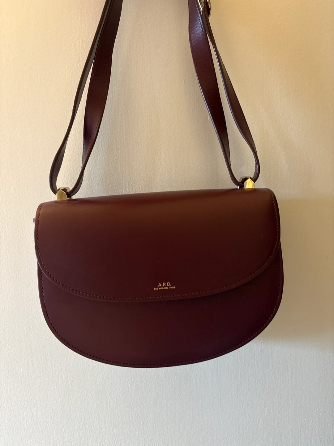 This is an A.P.C. shoulder bag in a deep burgundy colour. It's made from smooth leather with gold-tone hardware. The bag features a classic flap closure and an adjustable strap.