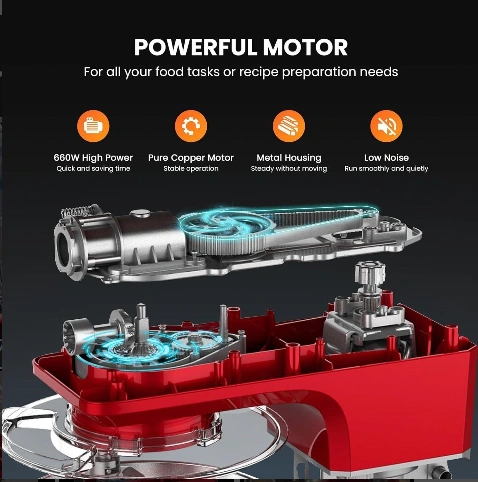Powerful 660W motor. Pure copper motor for stable operation. Metal housing. Low noise operation. Includes stainless steel mixing bowl and attachments. Easy to operate.