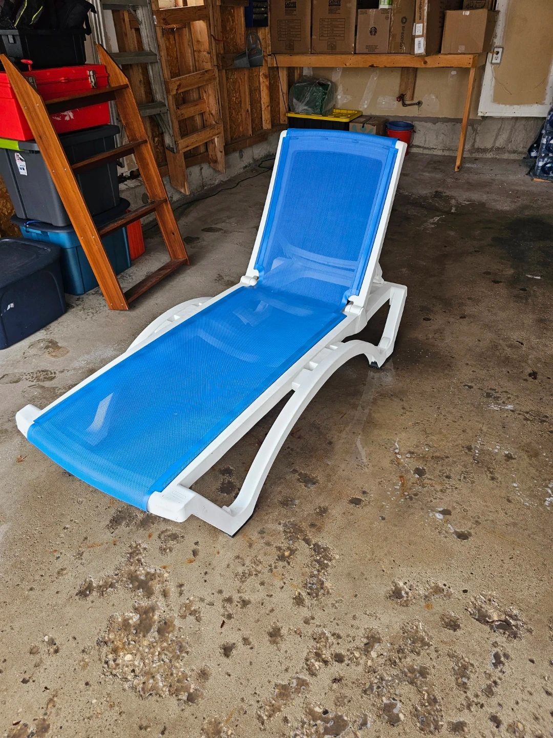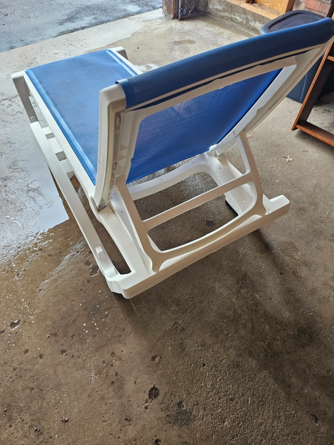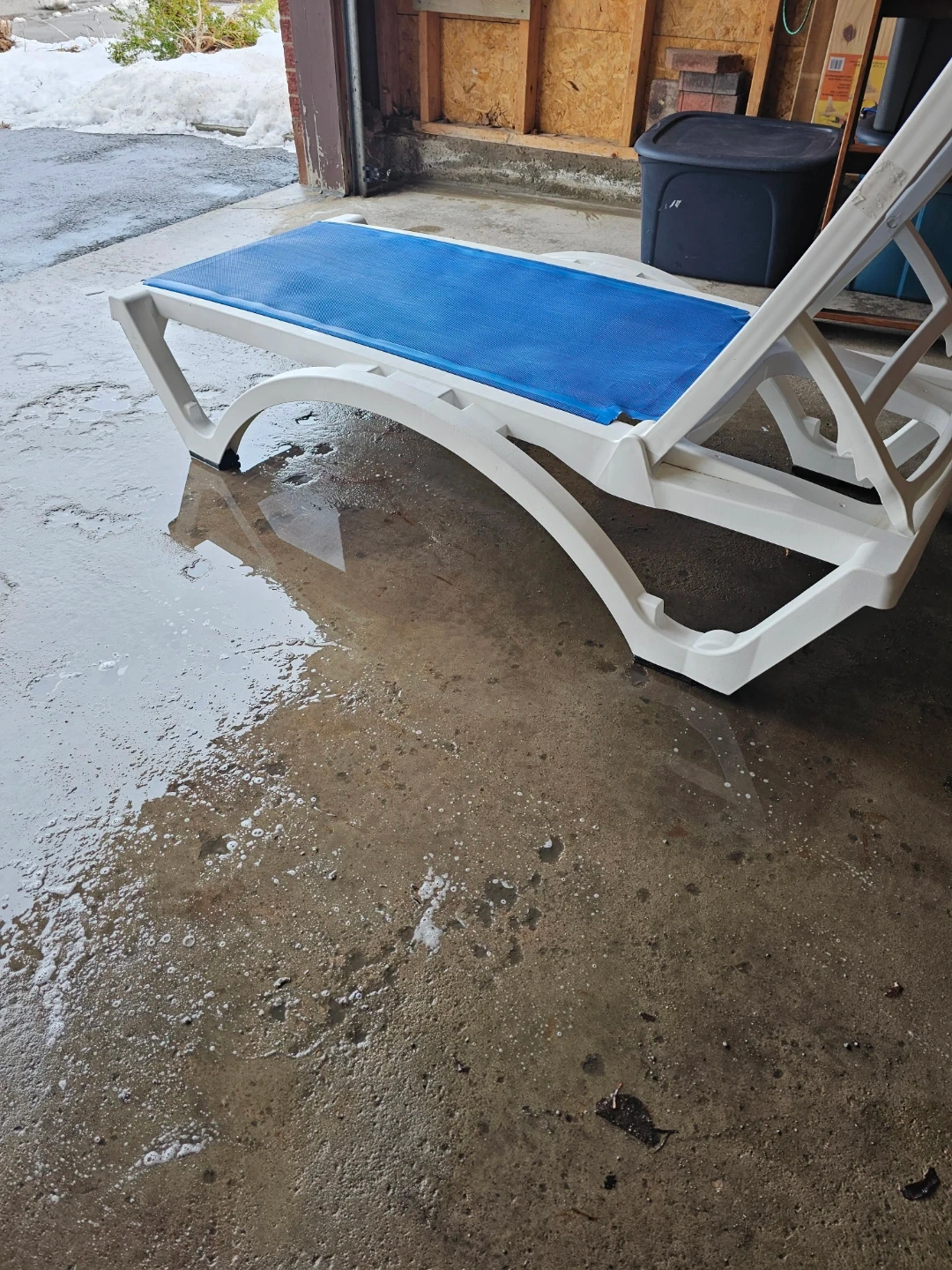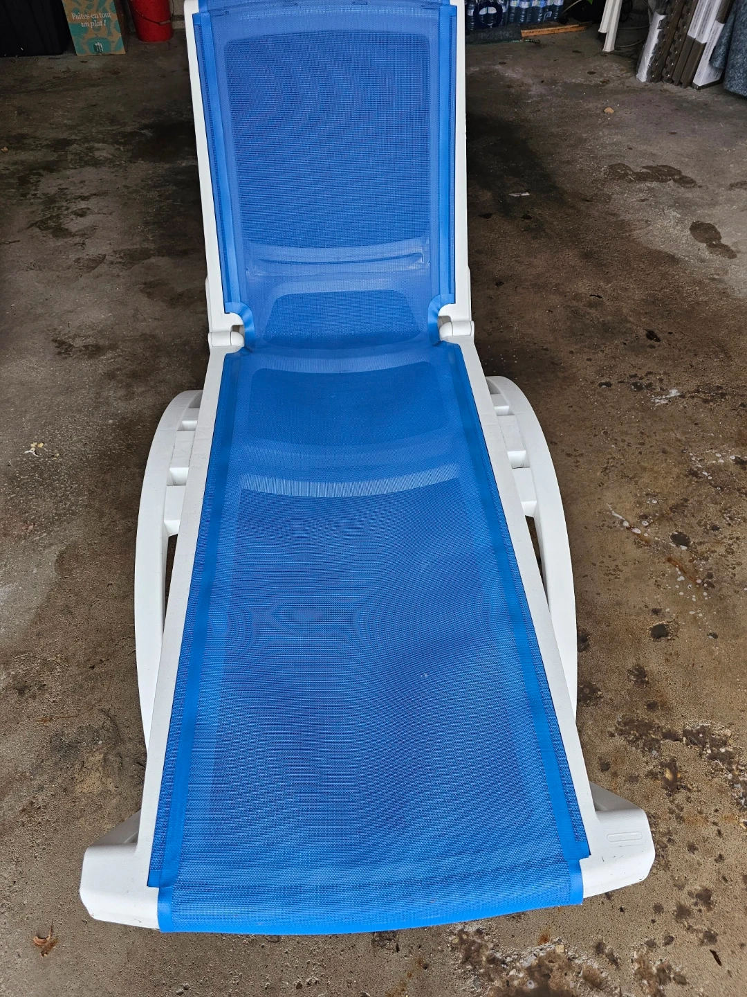 This chaise lounge chair features a white plastic frame and a blue mesh fabric. It's designed for outdoor relaxation. The chair is adjustable to different reclining positions.
