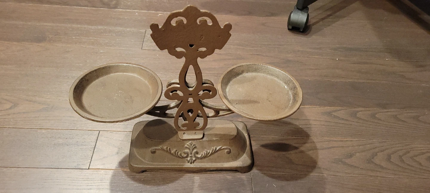 Ornate cast iron balance scale with two dishes. It's a decorative piece with an antique design. Useful for displaying small items or as a conversation starter!