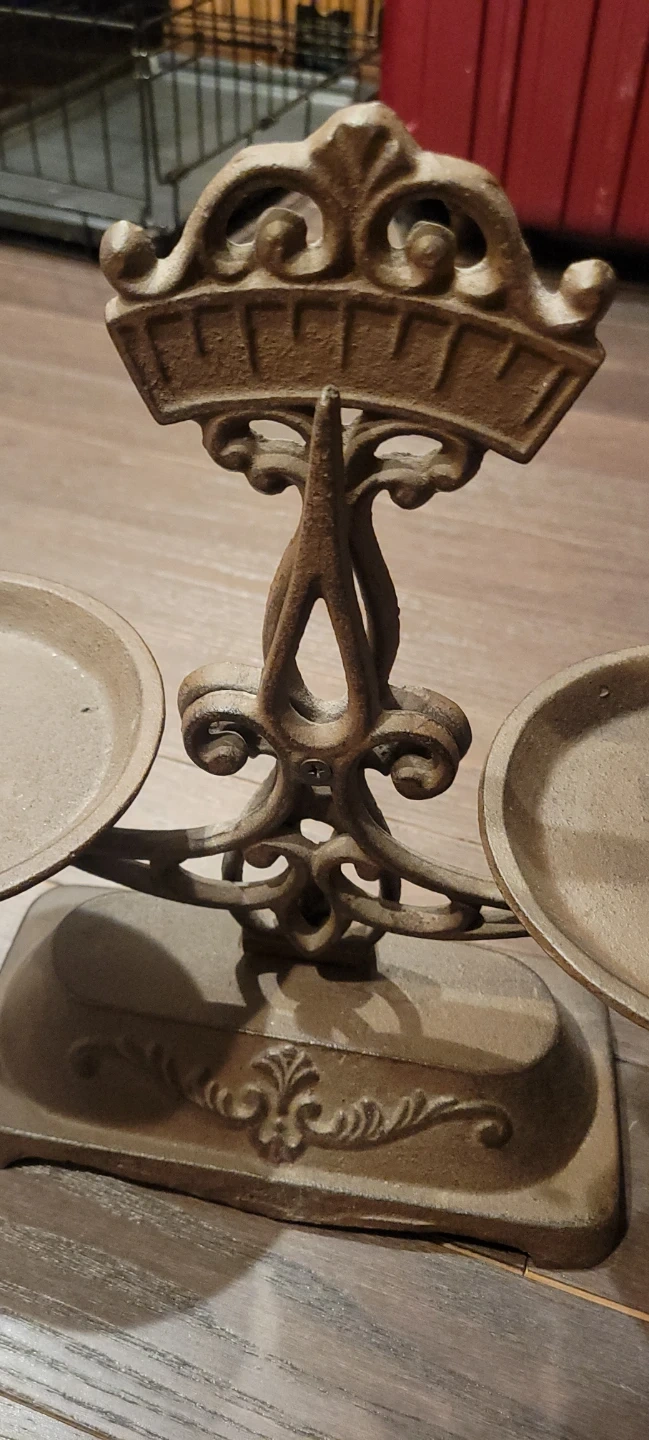 Ornate cast iron balance scale with two dishes. It's a decorative piece with an antique design. Useful for displaying small items or as a conversation starter!