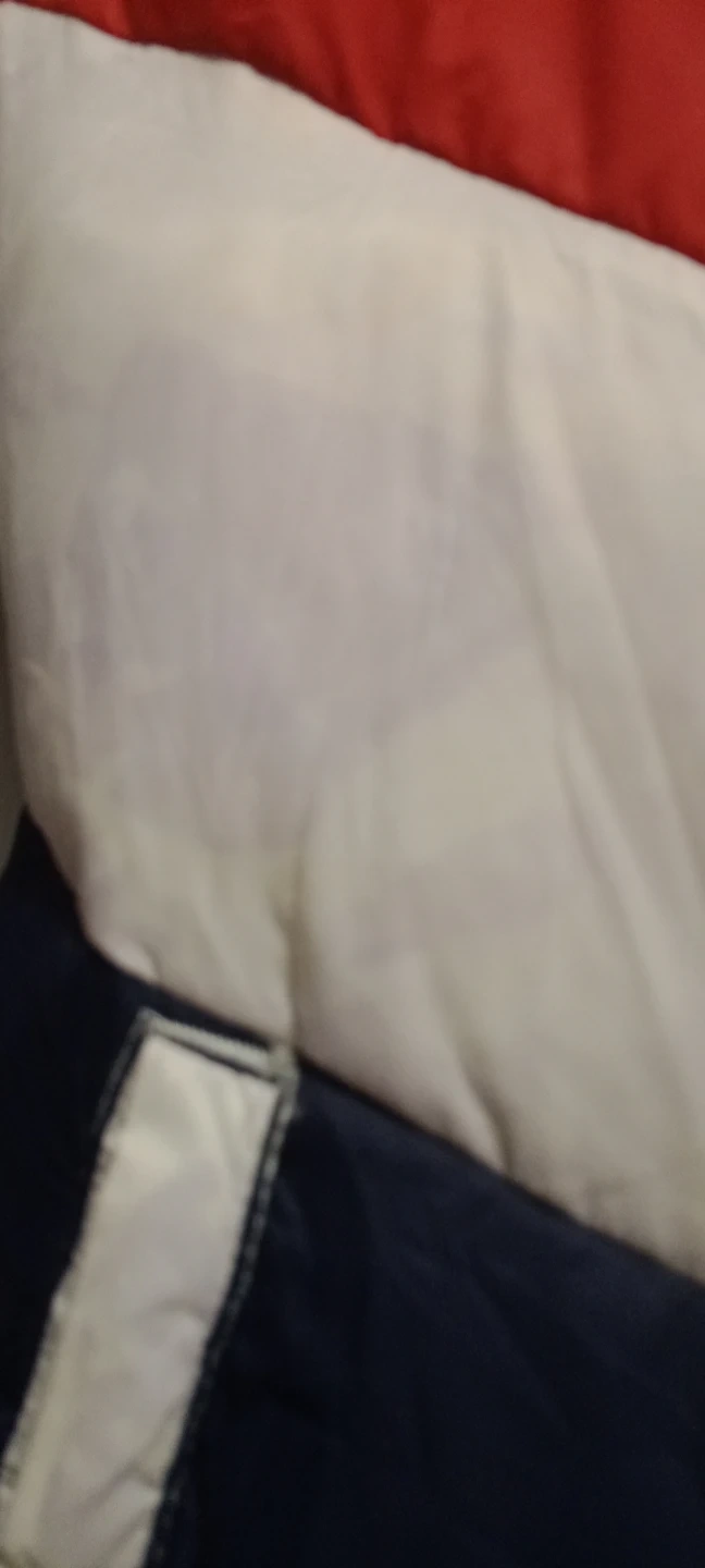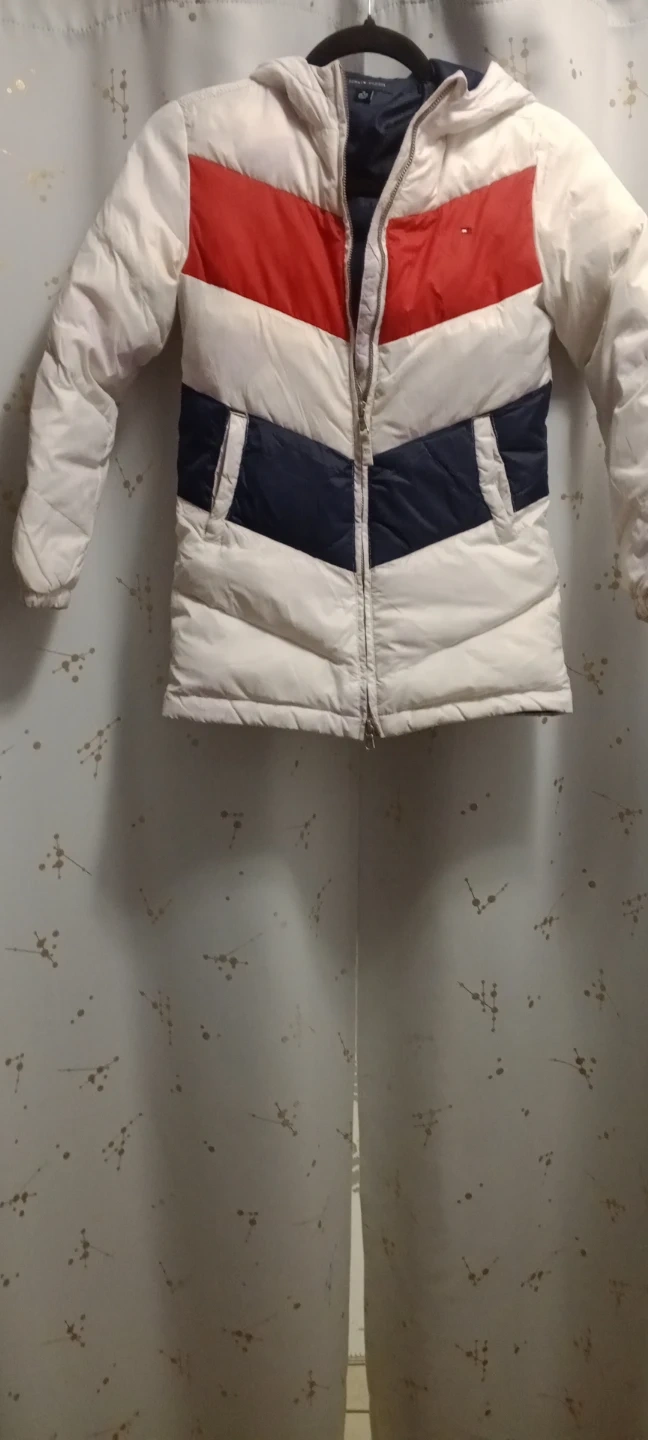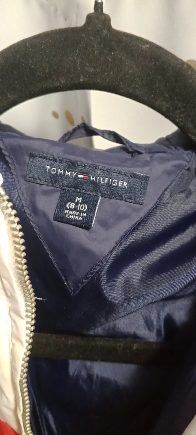 Tommy Hilfiger puffer jacket with down and feather fill. It's a size medium (8-10) with a colour-block design. Keeps you warm with a good balance of insulation and weight!