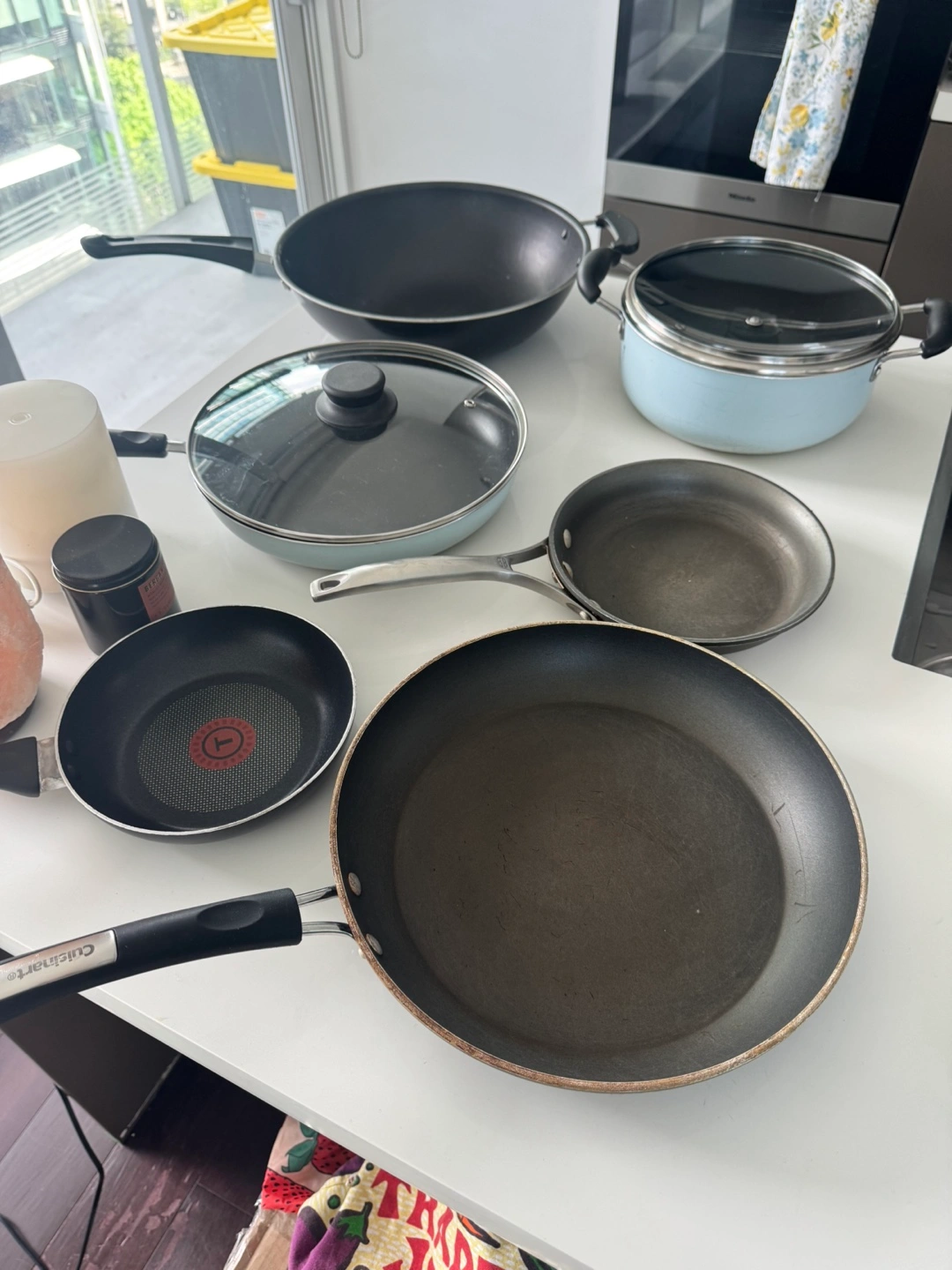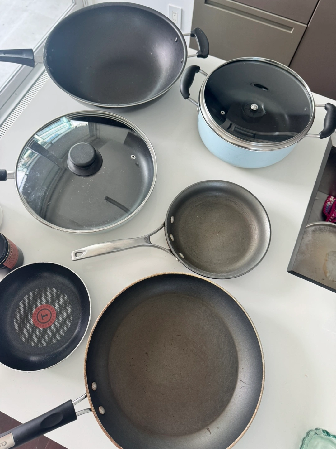 Assortment of cookware. Includes a wok, several frying pans of varying sizes, and a saucepan with lid. Non-stick surfaces. Great for everyday cooking.
