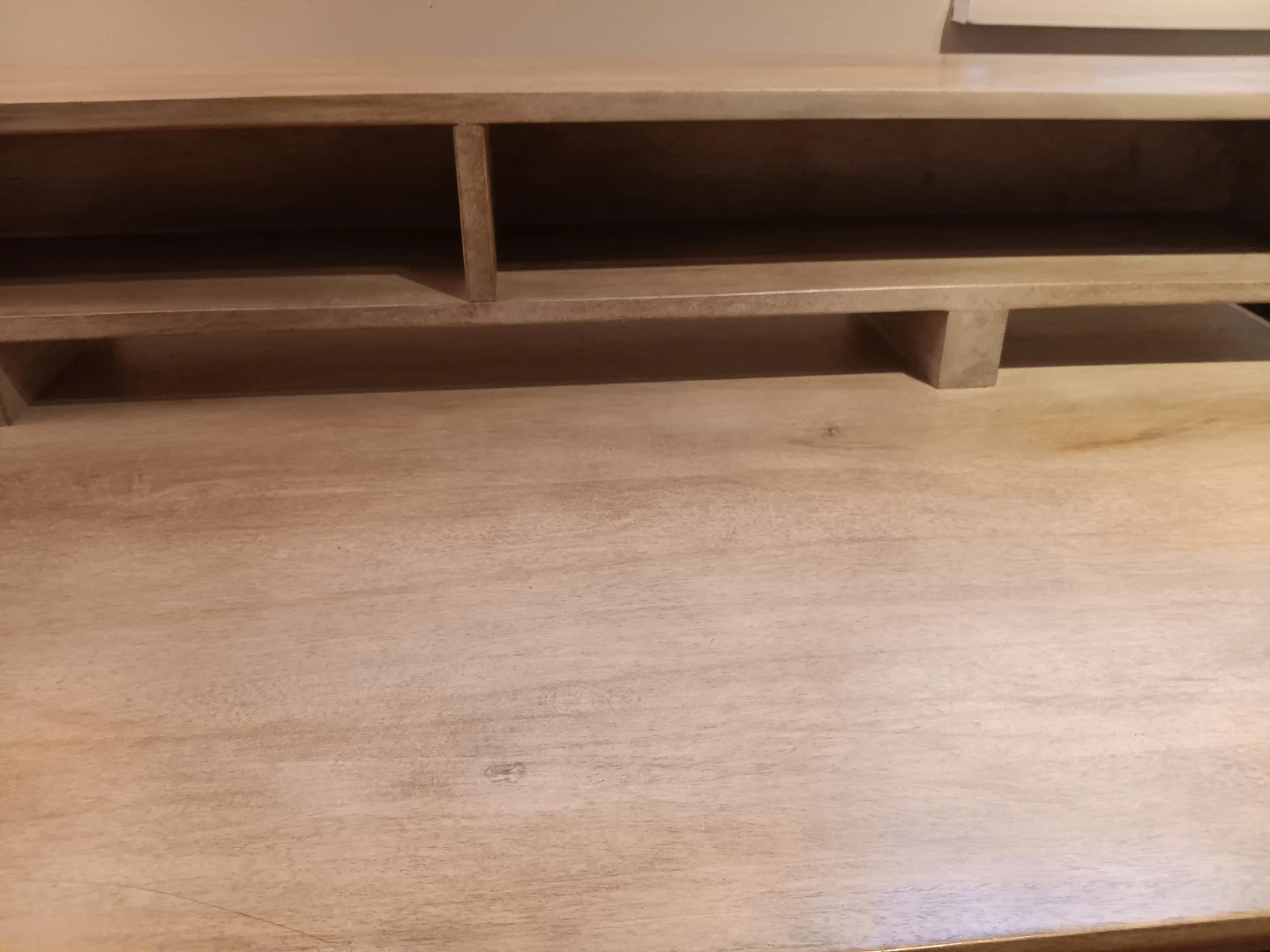 This is a wooden desk with a built-in shelf unit. It's got a light, distressed wood finish. Great for a small workspace or study area! Should have large truck or large transport as legs do not come off. Pick up only. Cash only. 75 OBO. Thank you.