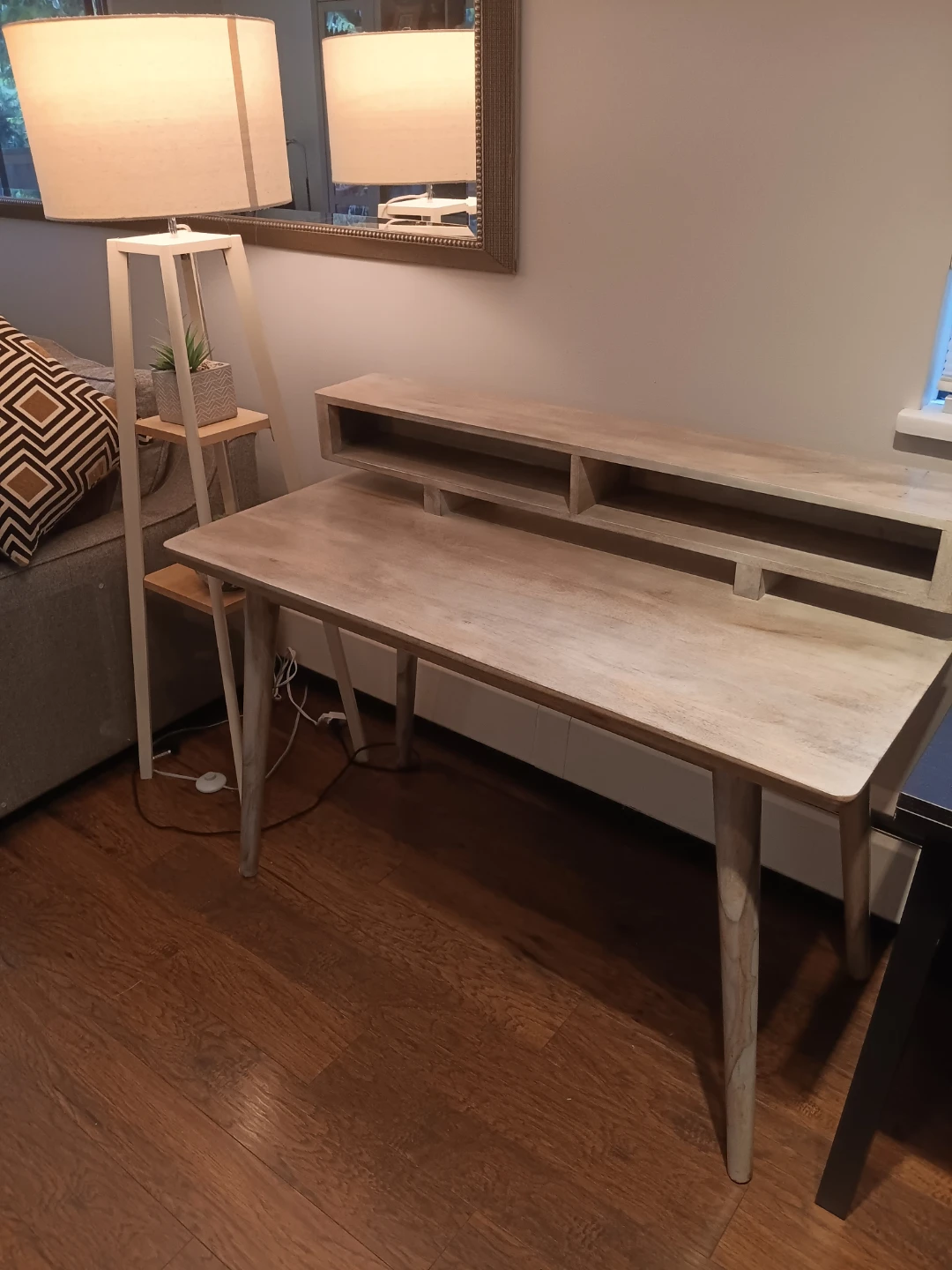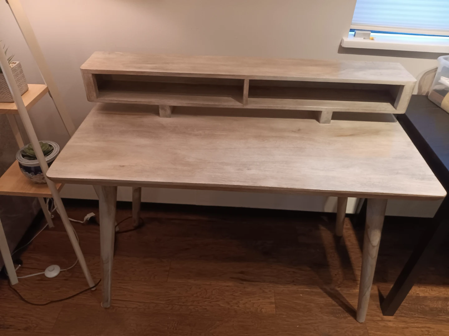 This is a wooden desk with a built-in shelf unit. It's got a light, distressed wood finish. Great for a small workspace or study area! Should have large truck or large transport as legs do not come off. Pick up only. Cash only. 75 OBO. Thank you.