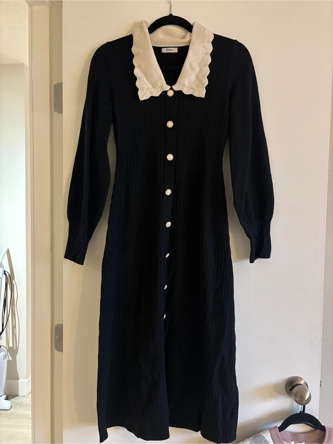 Kudose black long-sleeved midi dress. It features a contrasting white Peter Pan collar with decorative trim. This dress has a button-up front and a textured knit fabric. It's a stylish piece for various occasions.