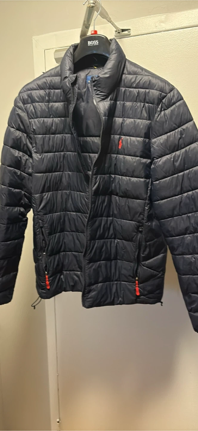 Polo Ralph Lauren puffer jacket in navy blue. It features a full zip closure and red accents on the zipper pulls. The iconic Polo logo is visible on the chest. This jacket is perfect for staying warm on cooler days!