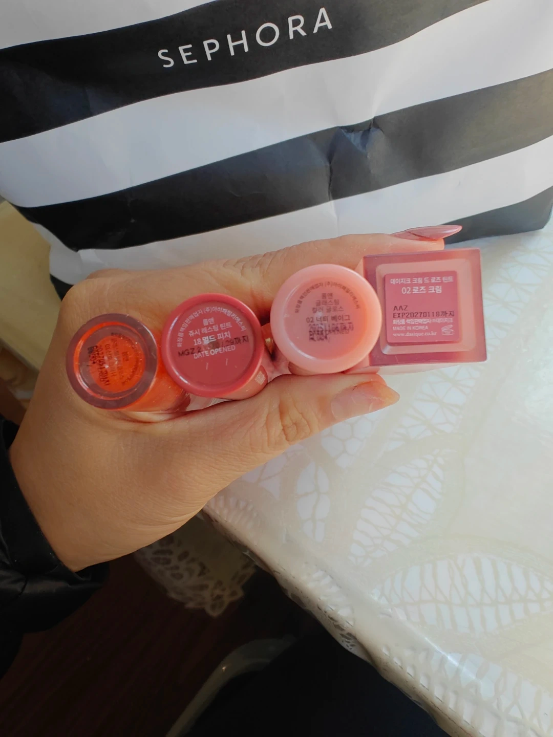 Four lip products featuring glasting water gloss and juicy lasting tints. Includes two Rom&nd items and two Dasique items. Expiry date on one item is EXP2027.01.18. all for $25