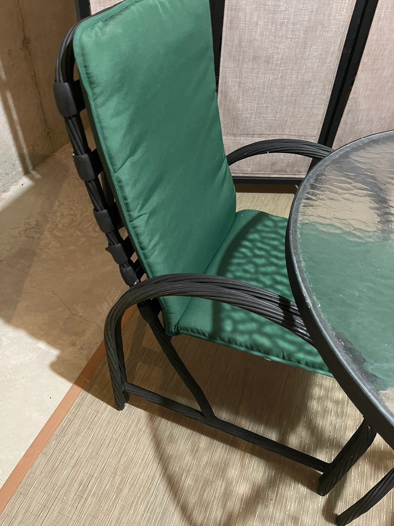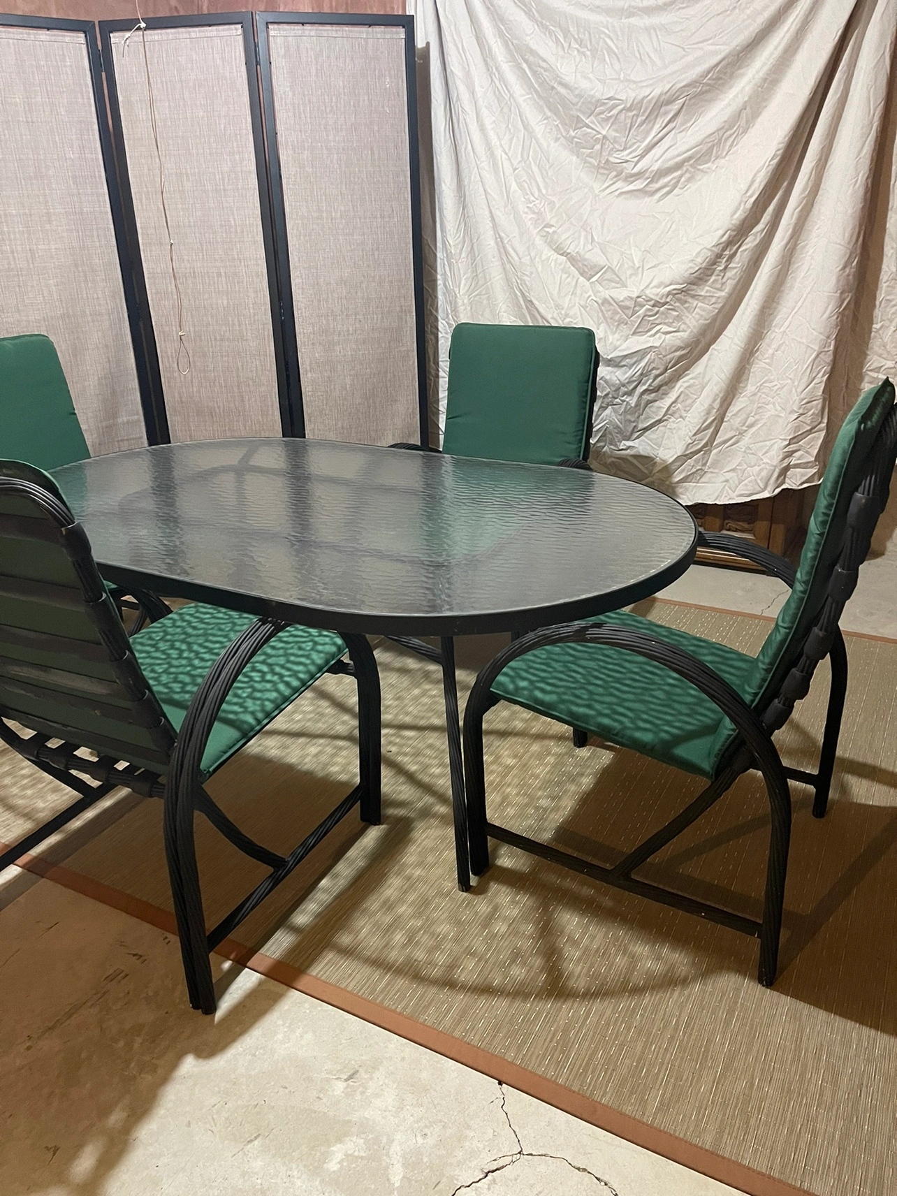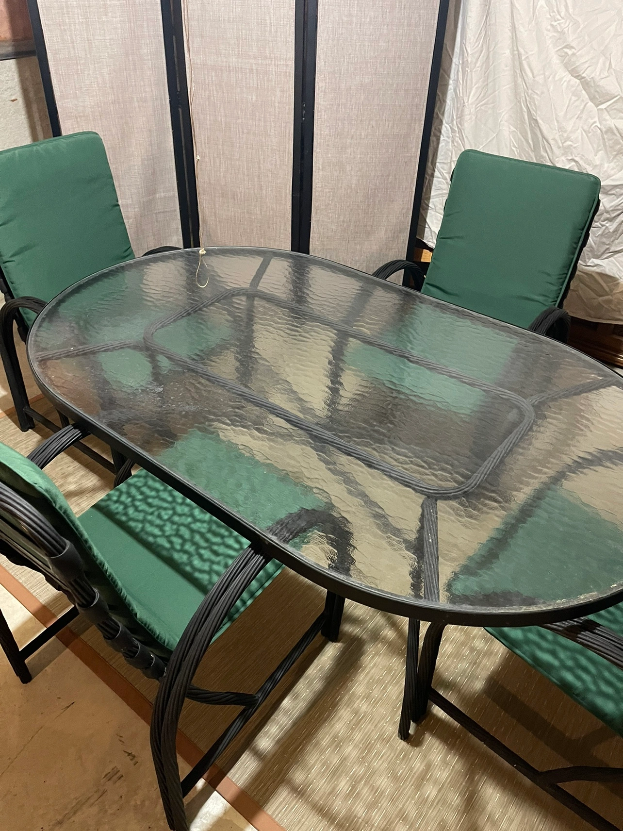 Glass topped oval (removable for transport) metal table with 4 chairs + seat cushions. Can fit 6 chairs at the table (only 4 available). Originally pink, but has been painted black. Comfortable and would look good on any deck!