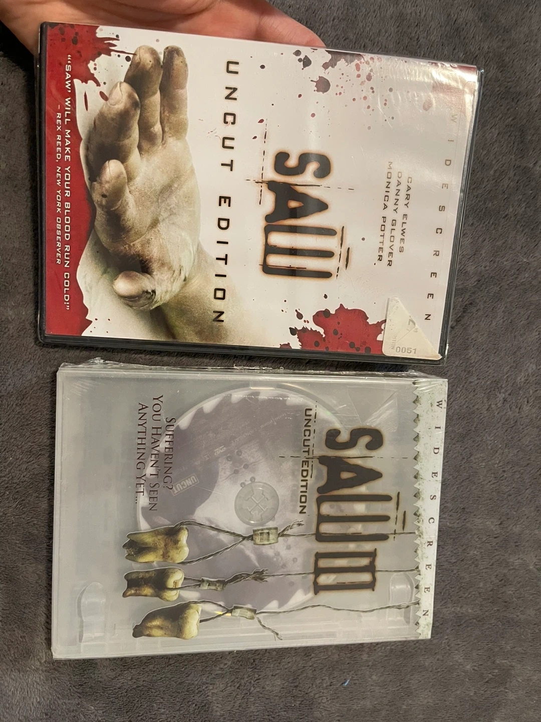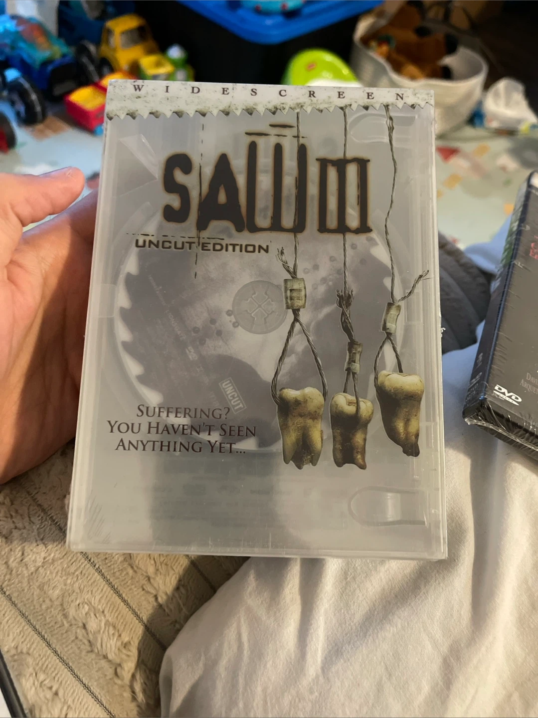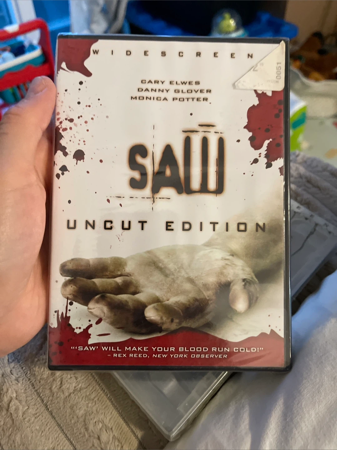 This is the Uncut Edition of the movie Saw on DVD. Widescreen format. Stars Cary Elwes, Danny Glover, and Monica Potter. Includes original case.