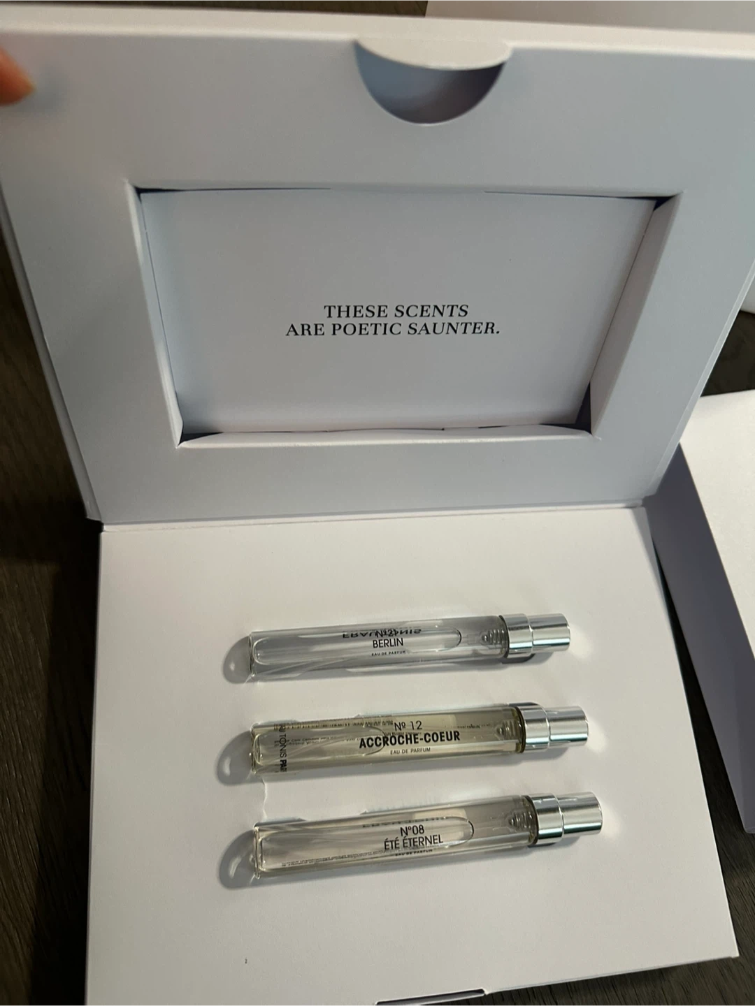 Selling a Frau Tonis Berlin Discovery Set. The set includes three eau de parfum samples: No. 21 Berlin, No. 12 Accroche-Coeur, and No. 08 Été Éternel. These scents are described as a poetic saunter. Comes with the original box and bag