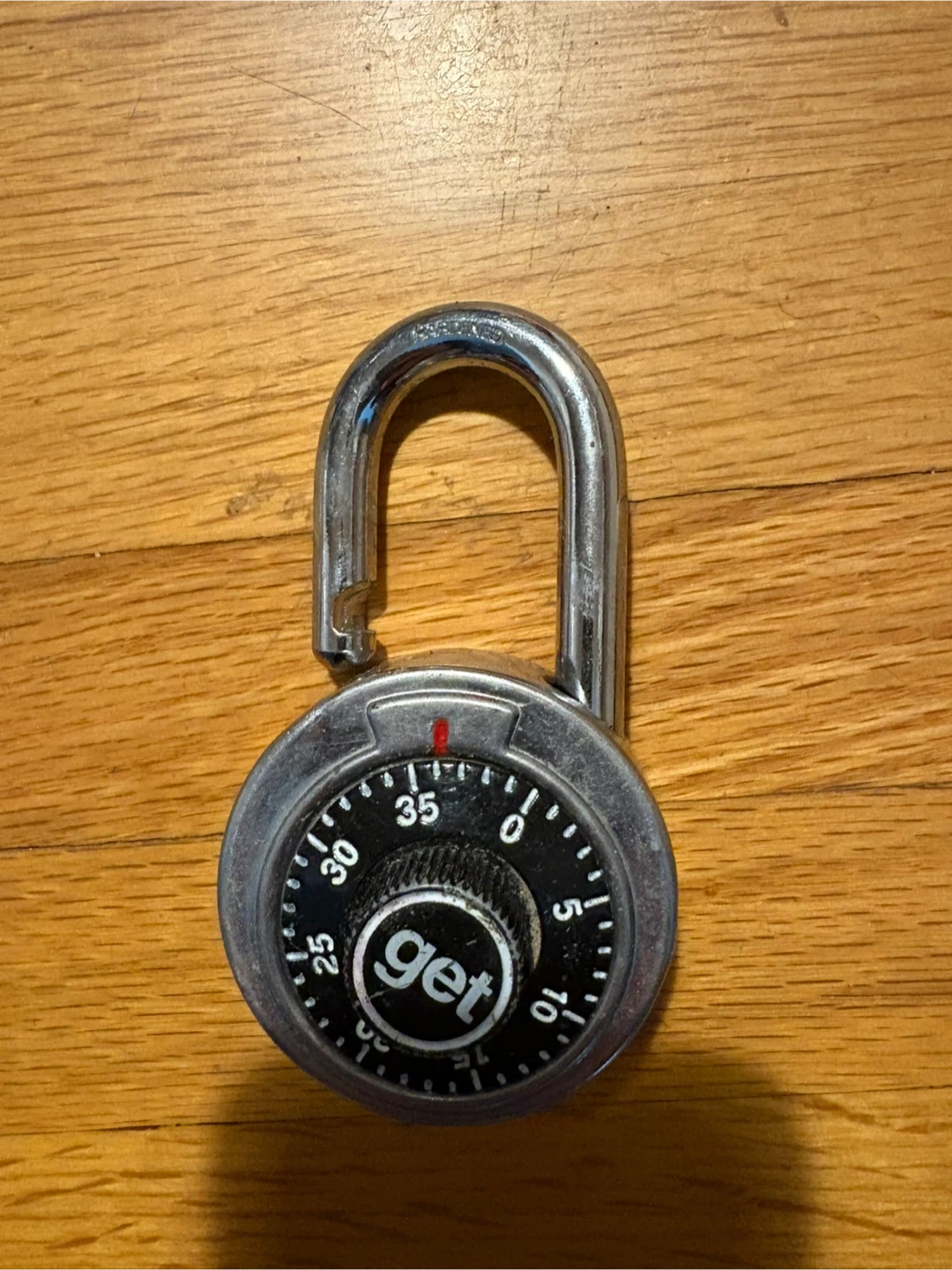 This is a metal combination lock with a dial that turns. It has numbers from 0 to 35 on the dial and a red indicator mark. It's a standard size lock.