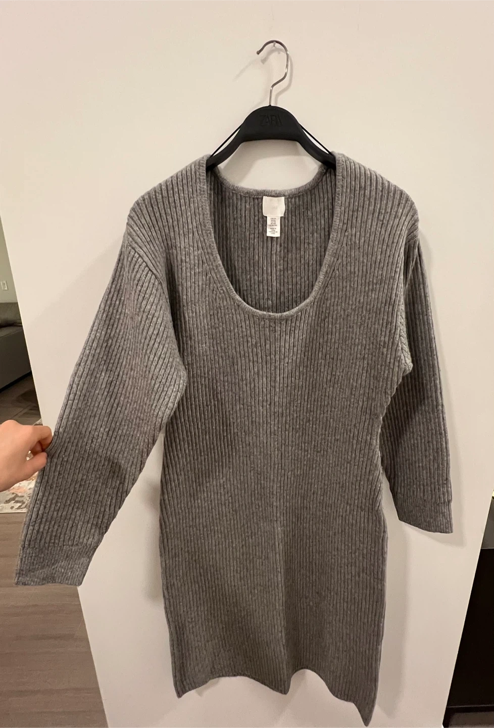 Grey ribbed knit dress from H&M. It features a flattering scoop neck and three-quarter length sleeves. Made from a soft, stretchy material for comfort. This dress is super versatile and can be dressed up or down!