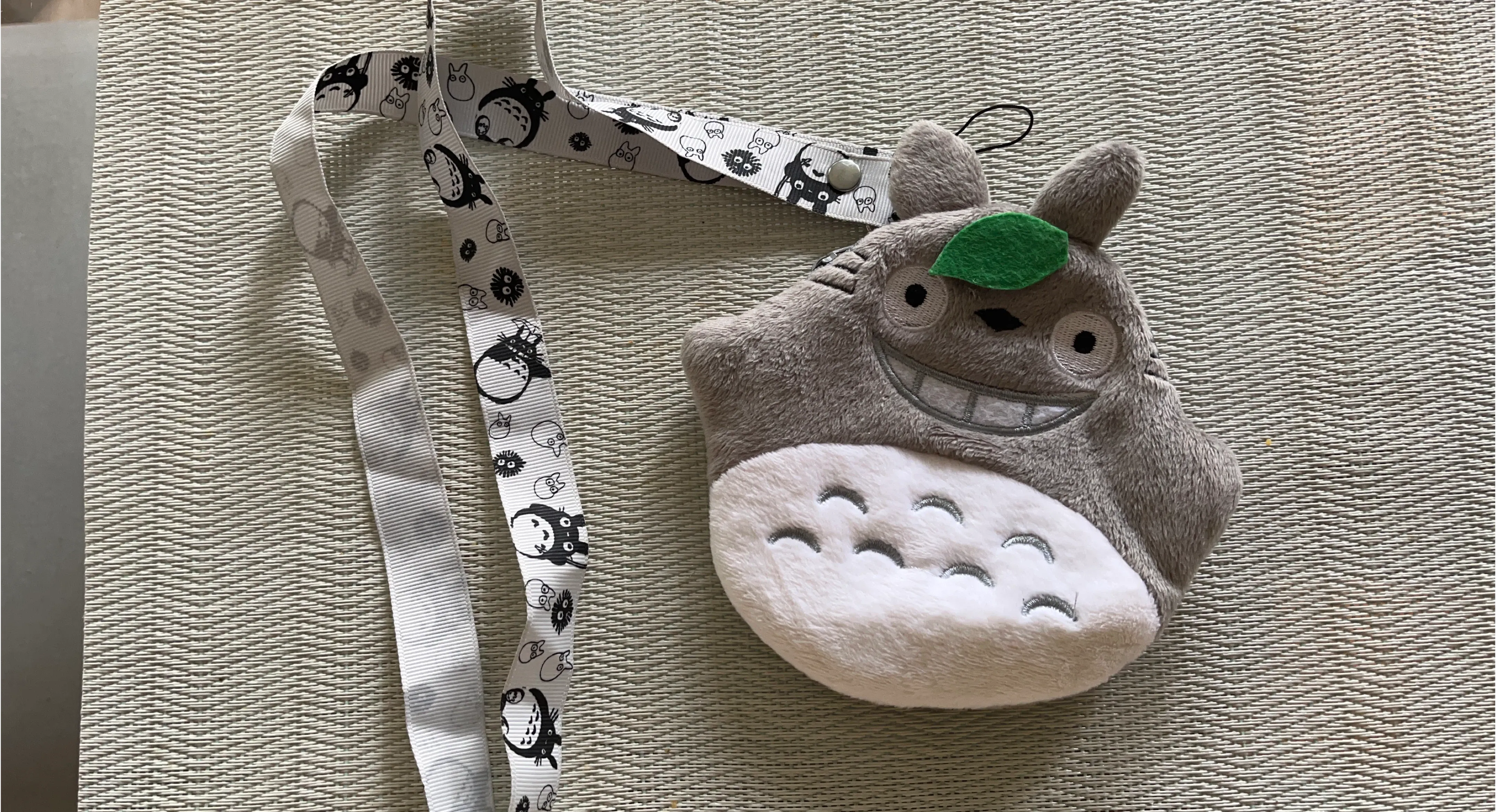 This is a cute Totoro plush coin pouch. It features a grey plush body with the character's signature markings and a green leaf accent. It includes a detachable lanyard with a pattern of Totoro and other characters from the film. It's made of soft plush material.