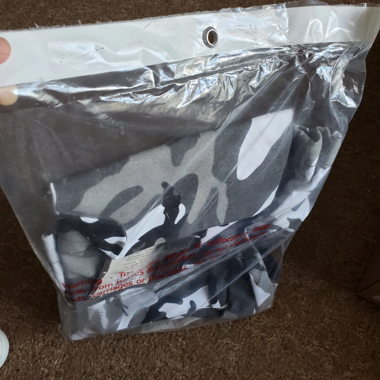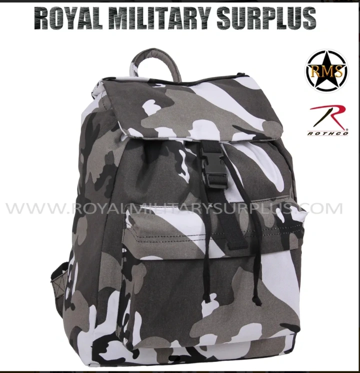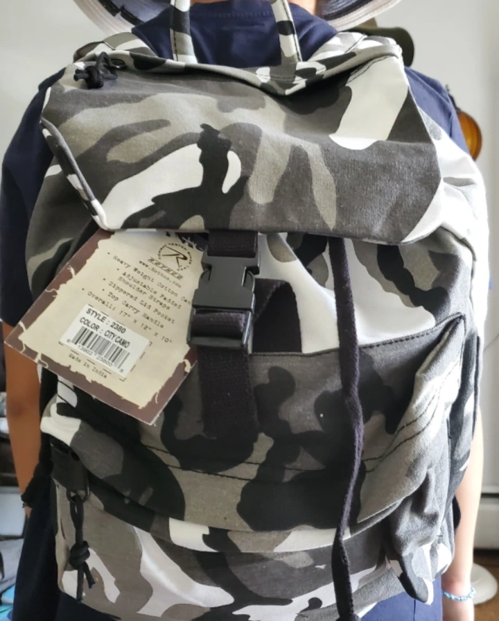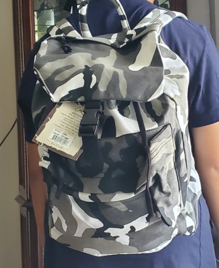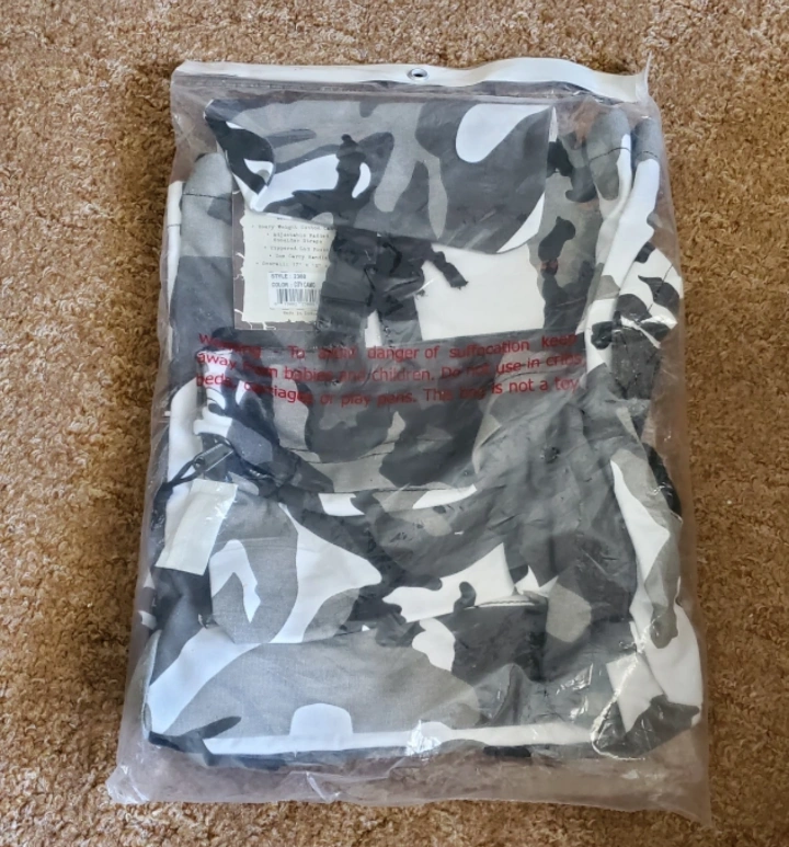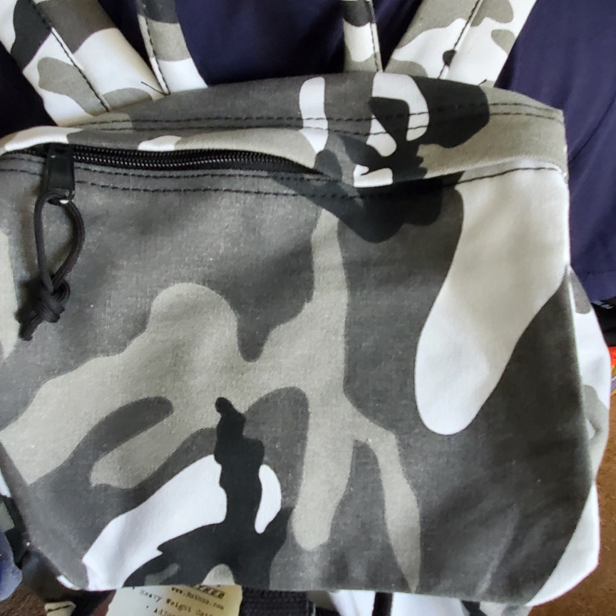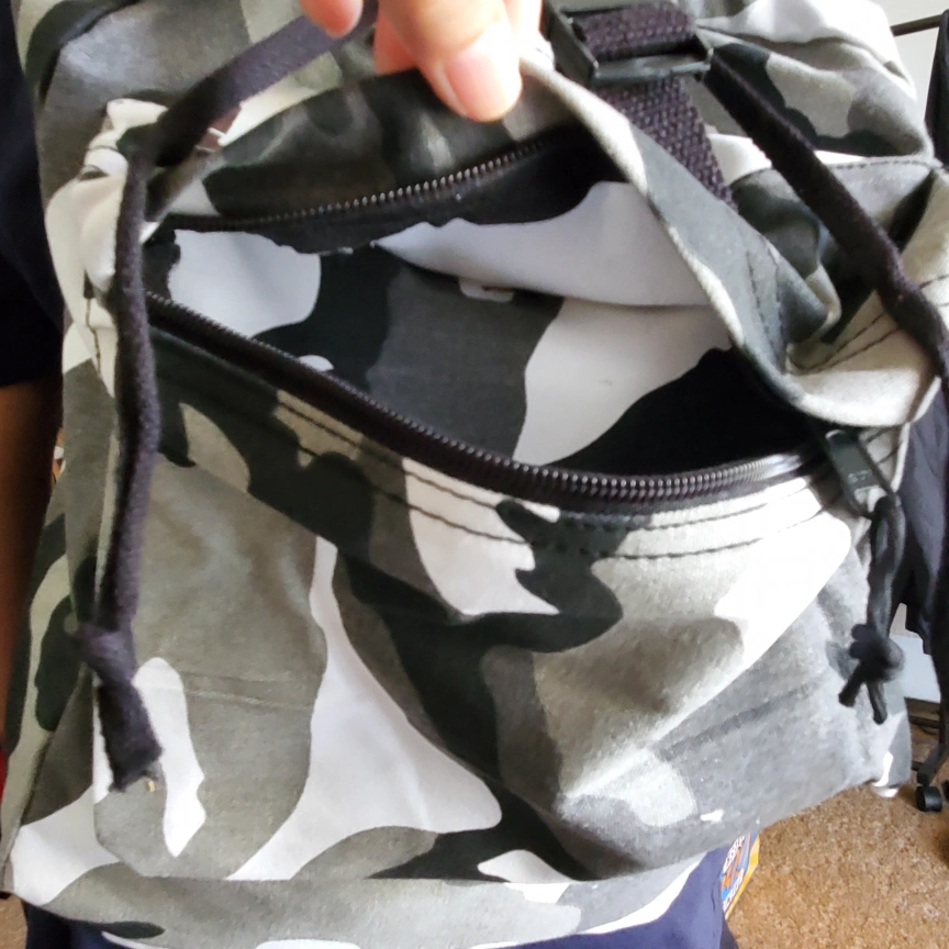 2pcs.available Camouflage backpack with a zippered front pocket and a drawstring closure at the top. The backpack also has a zippered side pocket and two mesh pockets on the inside. The straps are adjustable. Just opened from sealed package.