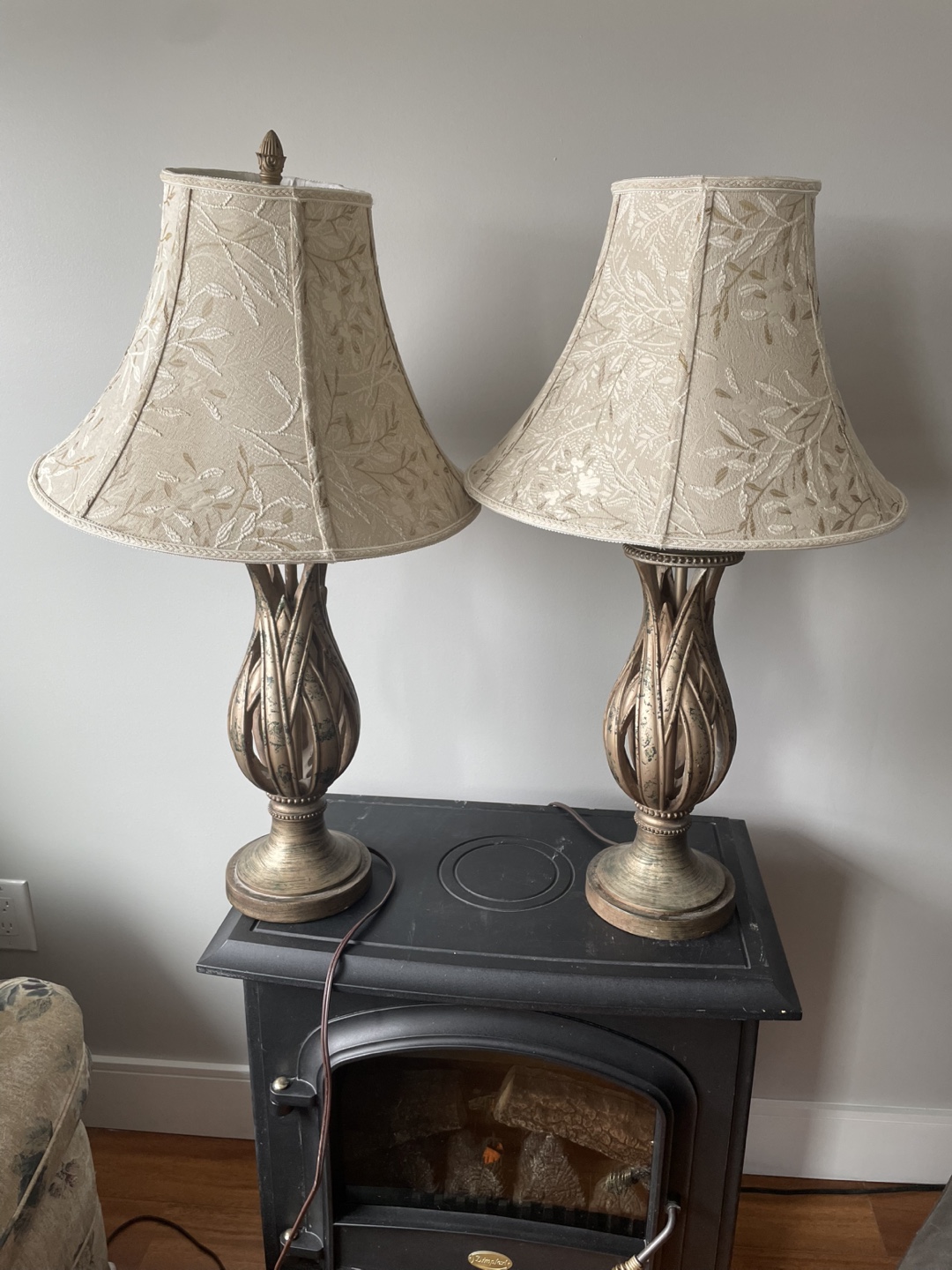 Matching table lamps. Ornate gold bases. Beige fabric lampshades with leaf pattern. Excellent condition.