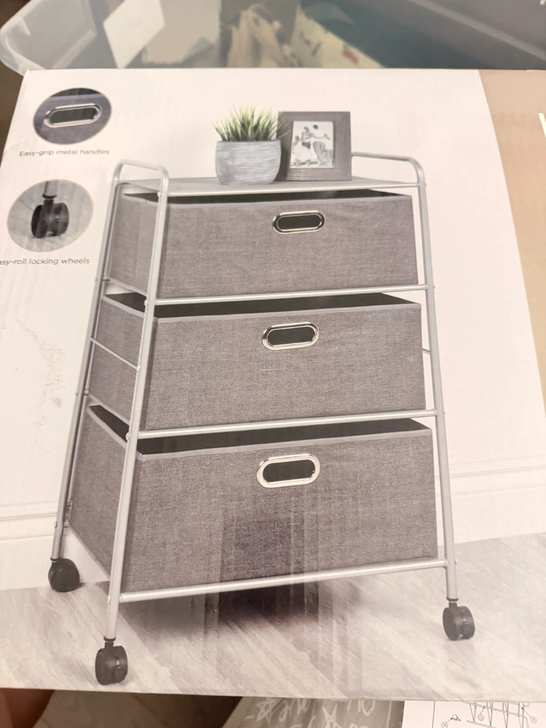 This Home Stuff 3 Drawer Rollstor Fabric Storage Cart comes with easy-grip metal handles and easy-roll locking wheels. It's made of fabric drawers and a metal frame. This cart is useful for organizing small spaces.