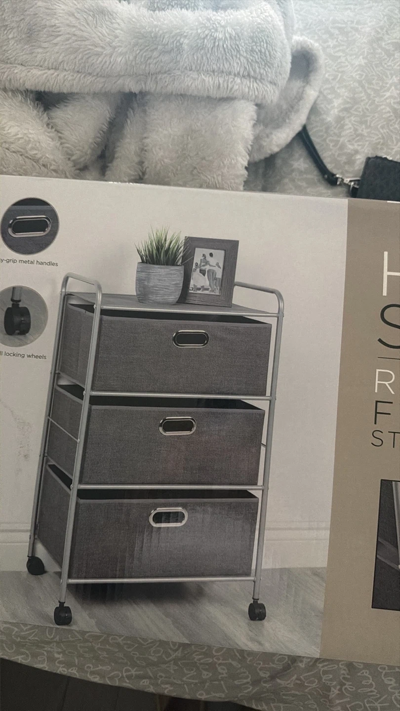 This Home Stuff 3 Drawer Rollstor Fabric Storage Cart comes with easy-grip metal handles and easy-roll locking wheels. It's made of fabric drawers and a metal frame. This cart is useful for organizing small spaces.