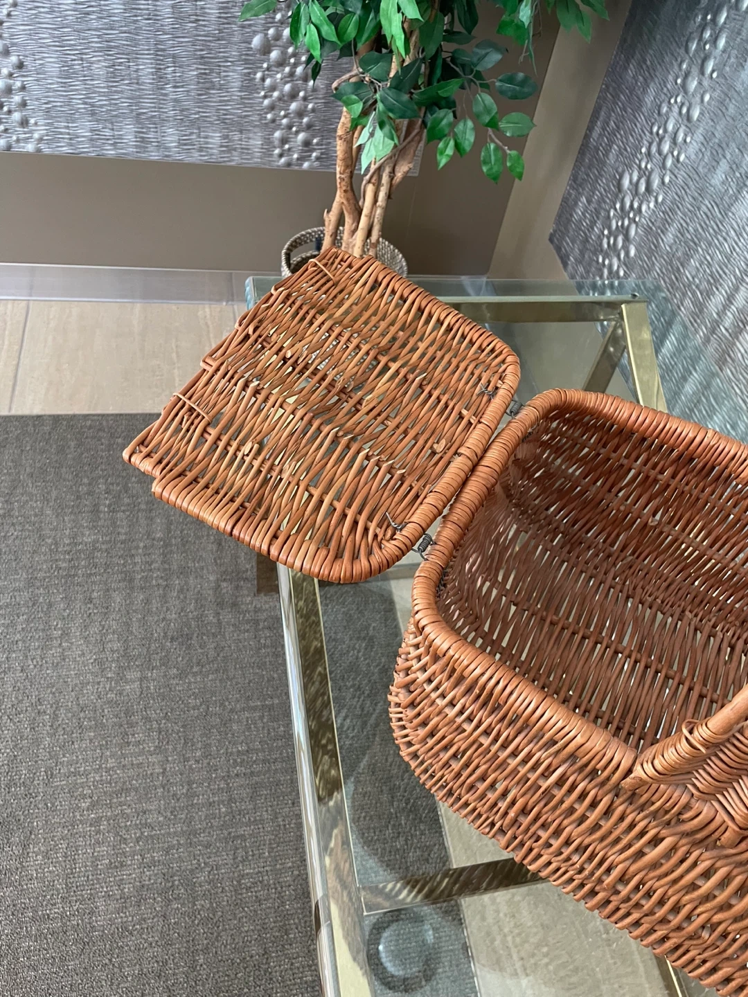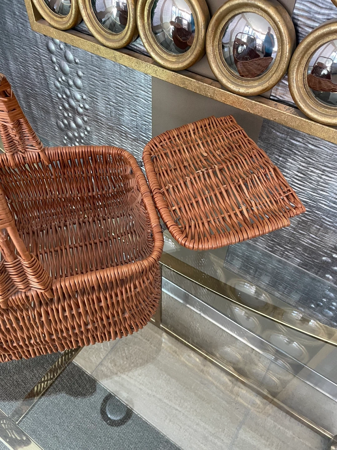 In very good vintage condition. There is a bit of the weave missing on the handle wrap but the basket , handle and lid is perfect.