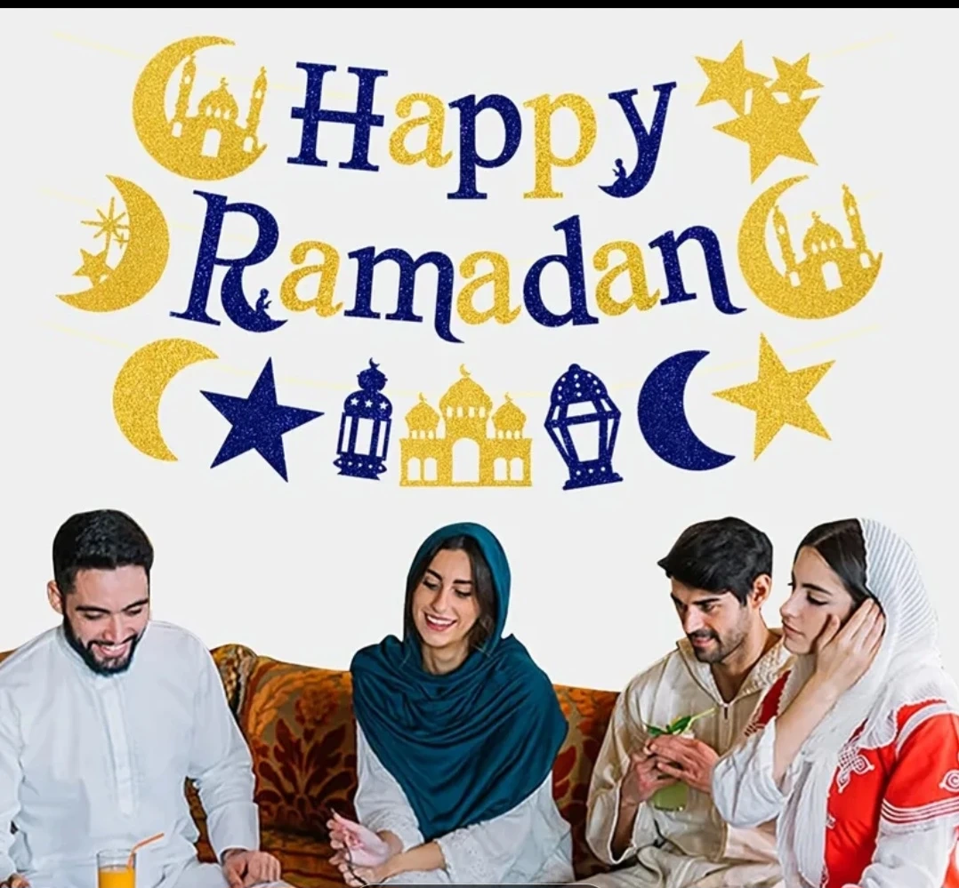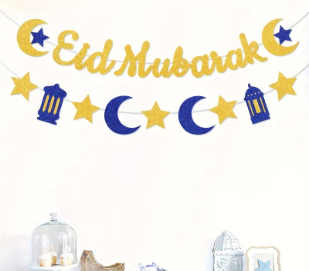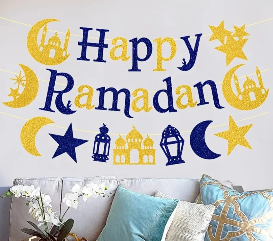 This banner set is perfect for celebrating Ramadan! It features glittery blue and gold lettering spelling out "Happy Ramadan" along with crescent moons, stars, mosques, and lanterns. It's a festive addition to your home decor for the holy month.
