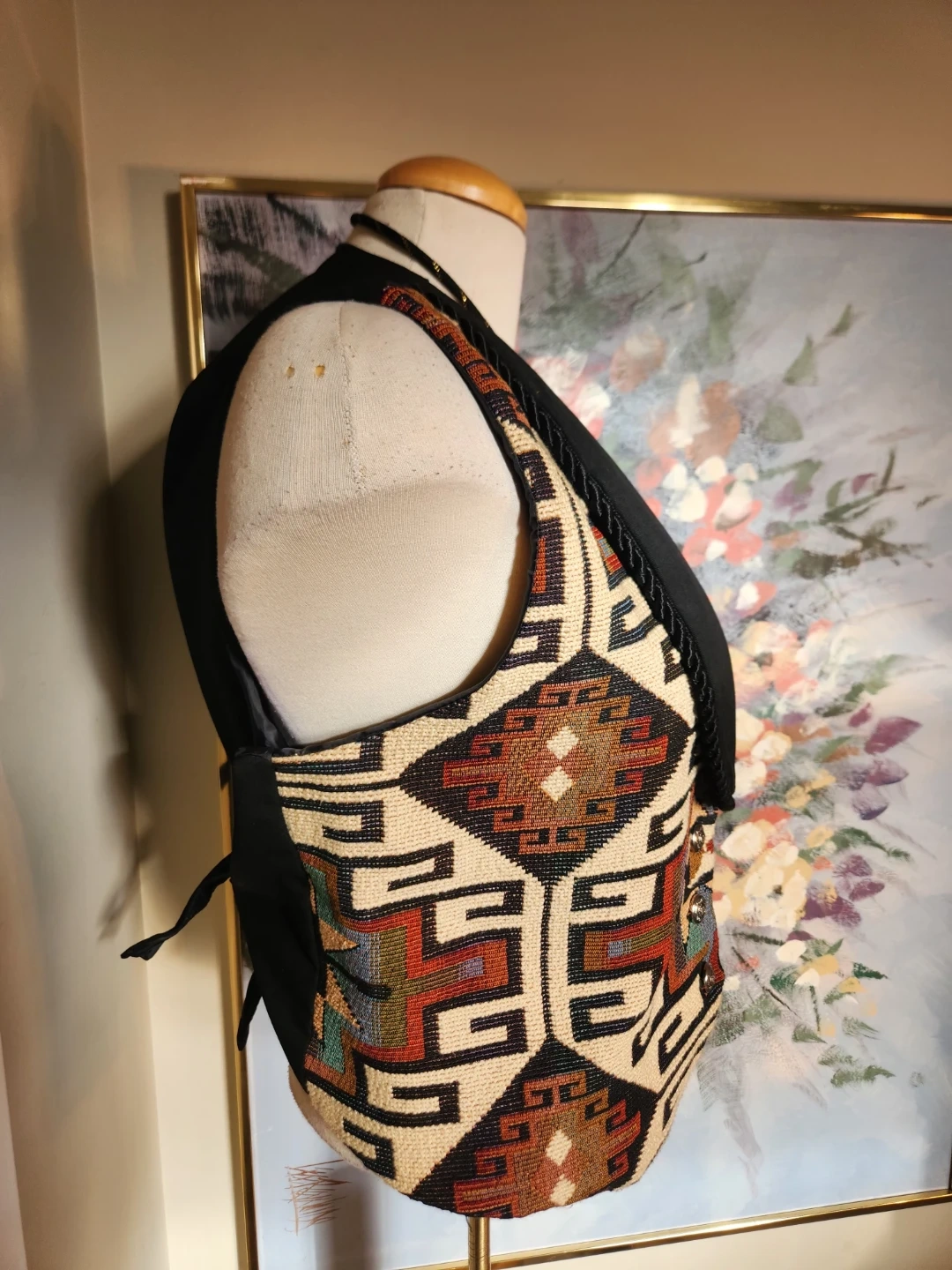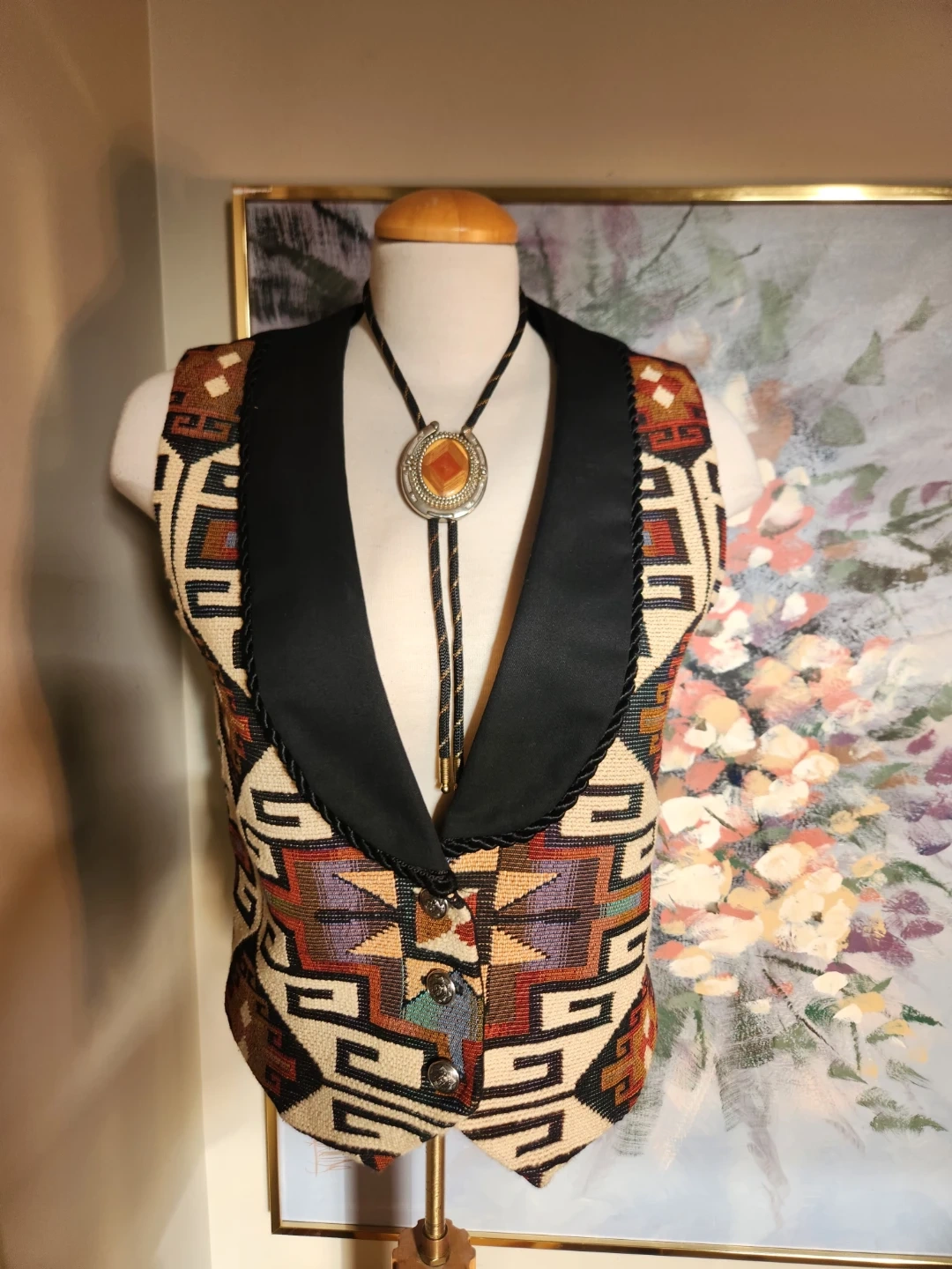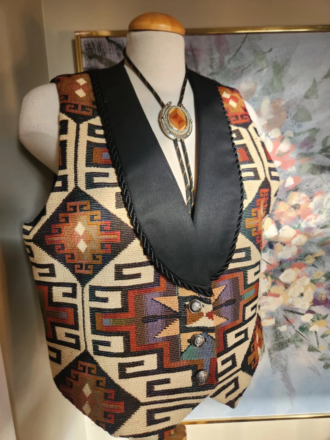 This unique UNISEX vest features a vibrant Southwestern tapestry pattern on the front and a classic black adjustable back. It's designed with a notched corded lapel and button closure. Vest length is 22 inches long, chest is 36 to 42 inches around. This jazzy country and western Style piece is EVERYTHING.