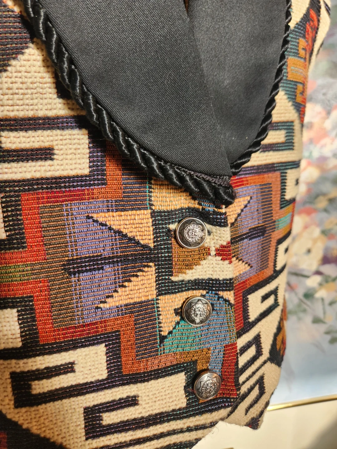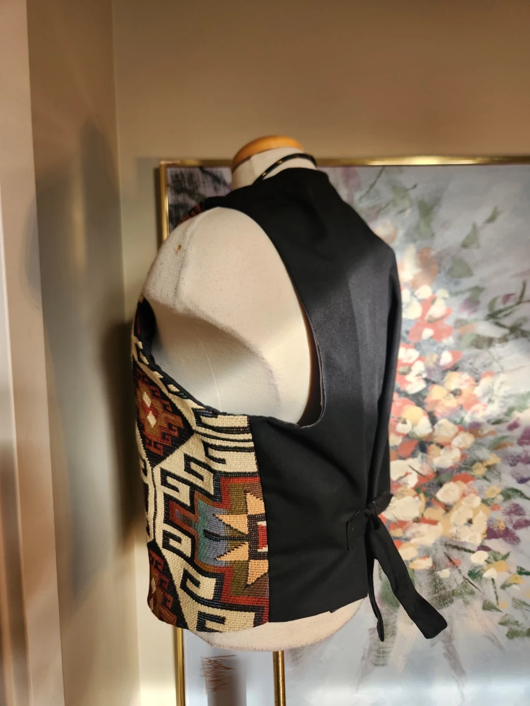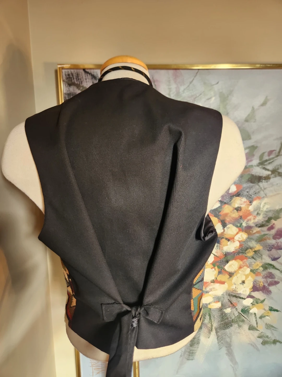 This unique UNISEX vest features a vibrant Southwestern tapestry pattern on the front and a classic black adjustable back. It's designed with a notched corded lapel and button closure. Vest length is 22 inches long, chest is 36 to 42 inches around. This jazzy country and western Style piece is EVERYTHING.