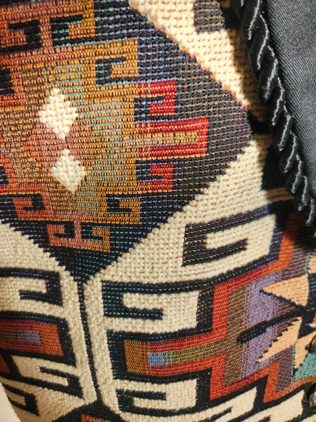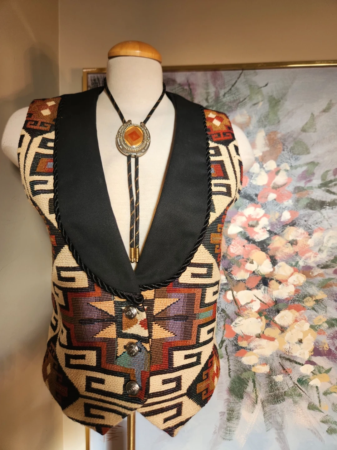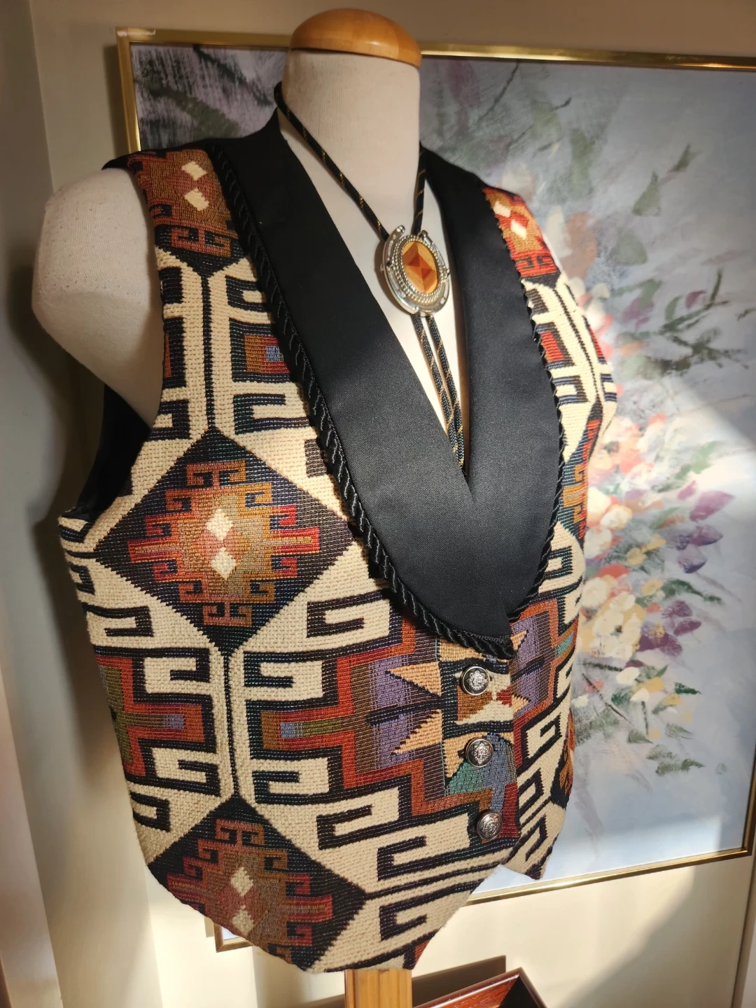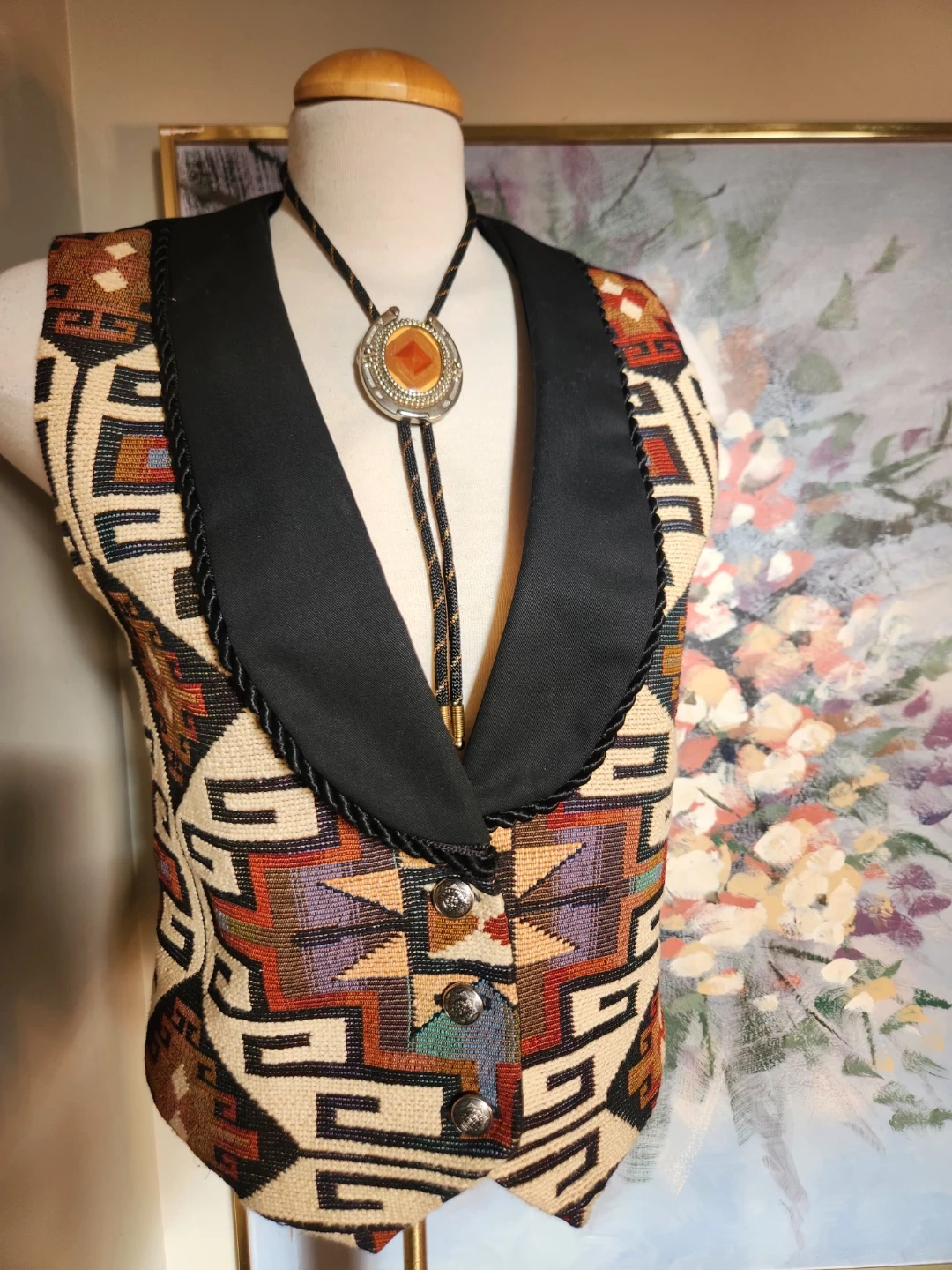 This unique UNISEX vest features a vibrant Southwestern tapestry pattern on the front and a classic black adjustable back. It's designed with a notched corded lapel and button closure. Vest length is 22 inches long, chest is 36 to 42 inches around. This jazzy country and western Style piece is EVERYTHING.