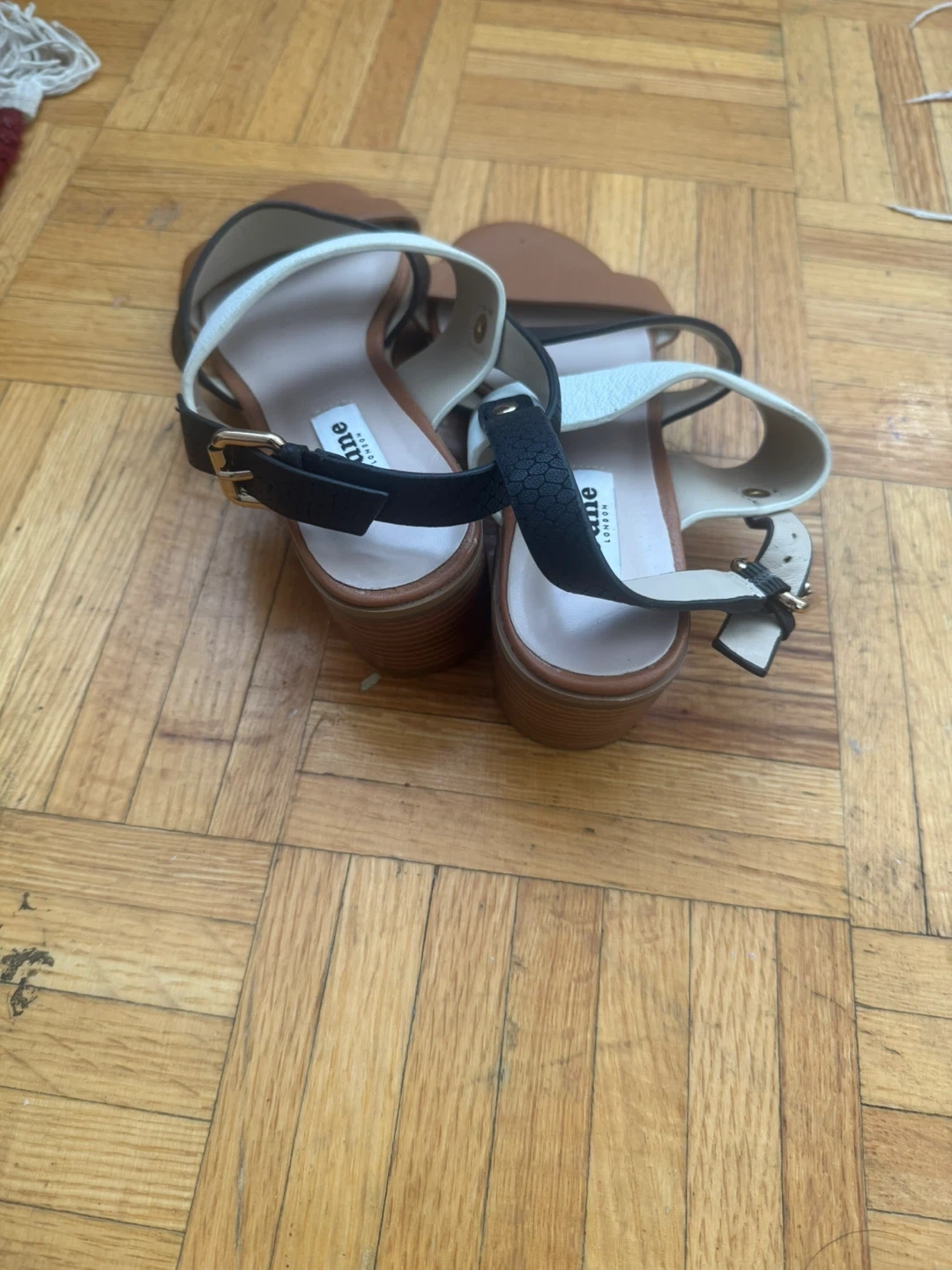 These Dune London wedge sandals feature a stylish mix of white, black, and tan straps. They have a secure buckle closure and a comfortable wedge heel. Perfect for warm weather occasions!