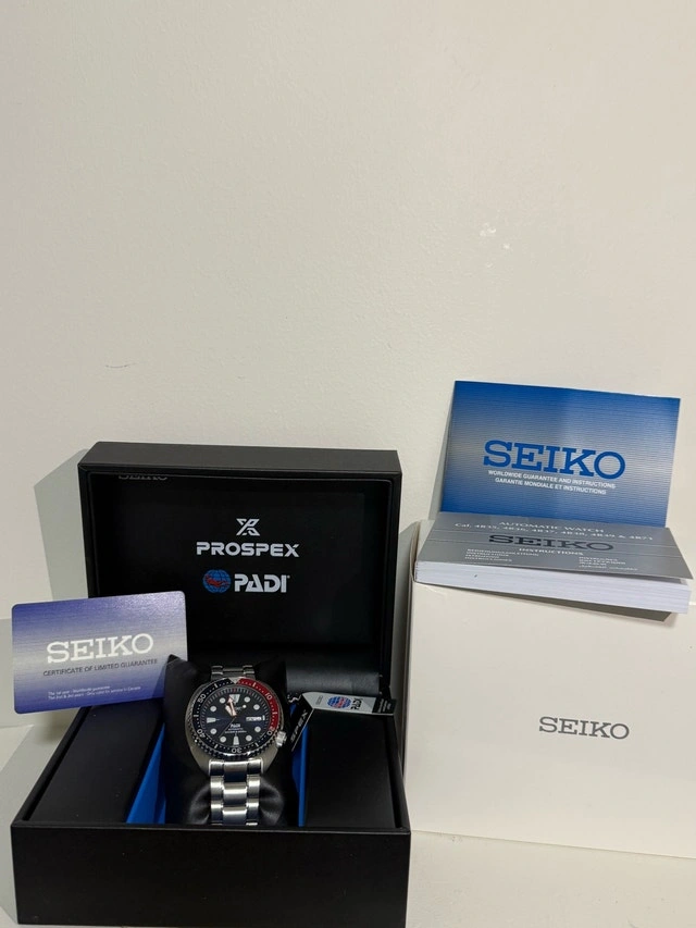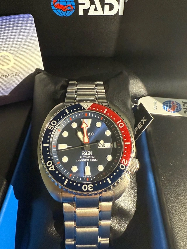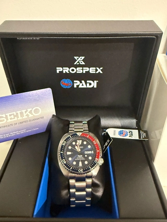 Seiko Prospex PADI Automatic Diver Watch. Original price: $550. Selling price: $500. Features: Automatic movement, 200m water resistant (Diver’s 200m), stainless steel bracelet, iconic Pepsi bezel (blue & red), day & date display, PADI special edition. Includes: Original Seiko Prospex box, PADI tag, instruction/manual booklet, warranty/authenticator card. Condition: Brand New. Very well taken care of. No major scratches.