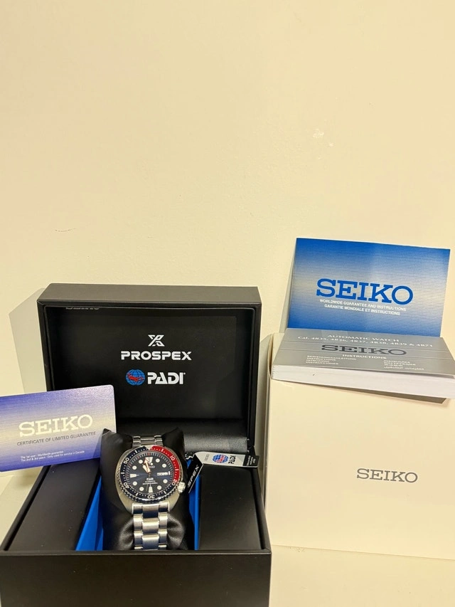 Seiko Prospex PADI Automatic Diver Watch. Original price: $550. Selling price: $500. Features: Automatic movement, 200m water resistant (Diver’s 200m), stainless steel bracelet, iconic Pepsi bezel (blue & red), day & date display, PADI special edition. Includes: Original Seiko Prospex box, PADI tag, instruction/manual booklet, warranty/authenticator card. Condition: Brand New. Very well taken care of. No major scratches.