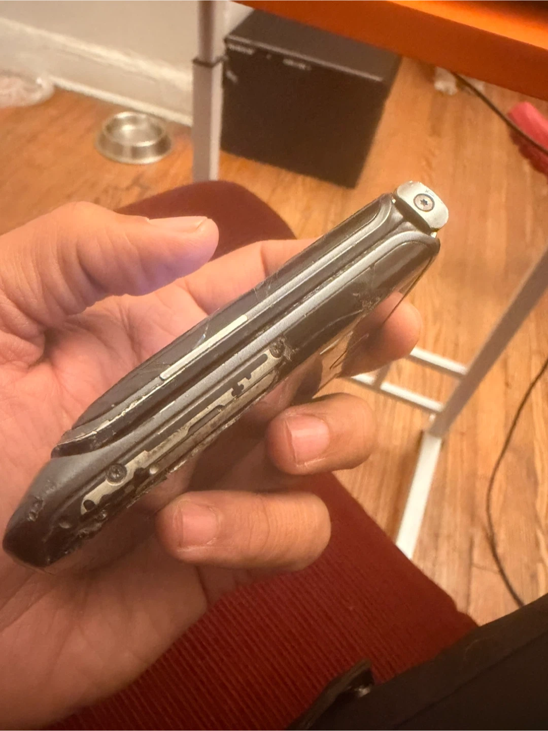 This is a used Motorola RAZR V3 cell phone. It appears to be damaged and is being sold for parts or repair. The outer casing is cracked and peeling in several areas. The screen is also cracked.