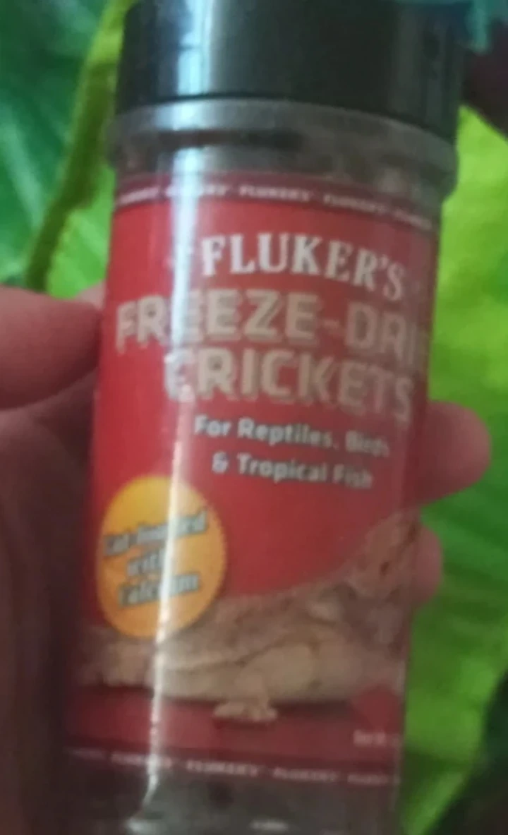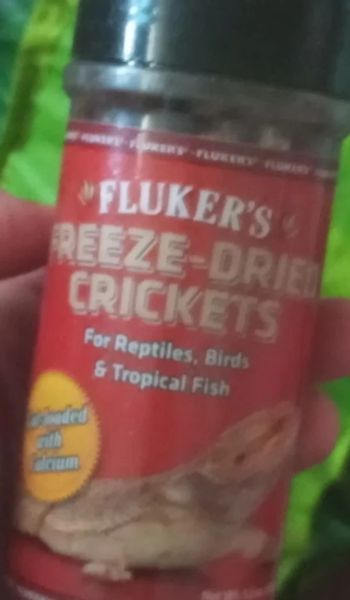 Fluker's Freeze-Dried Crickets for reptiles, birds, and tropical fish. Fortified with calcium. Net Wt. 1.2 oz (34g).