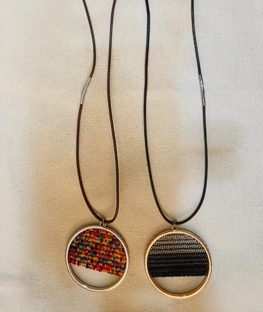 This listing is for two unique necklaces. One features a colourful beaded pendant, and the other has a black and grey striped beaded pendant. Both have thin leather-like cords with a small metal clasp. Perfect for adding a pop of colour or pattern to your outfit!