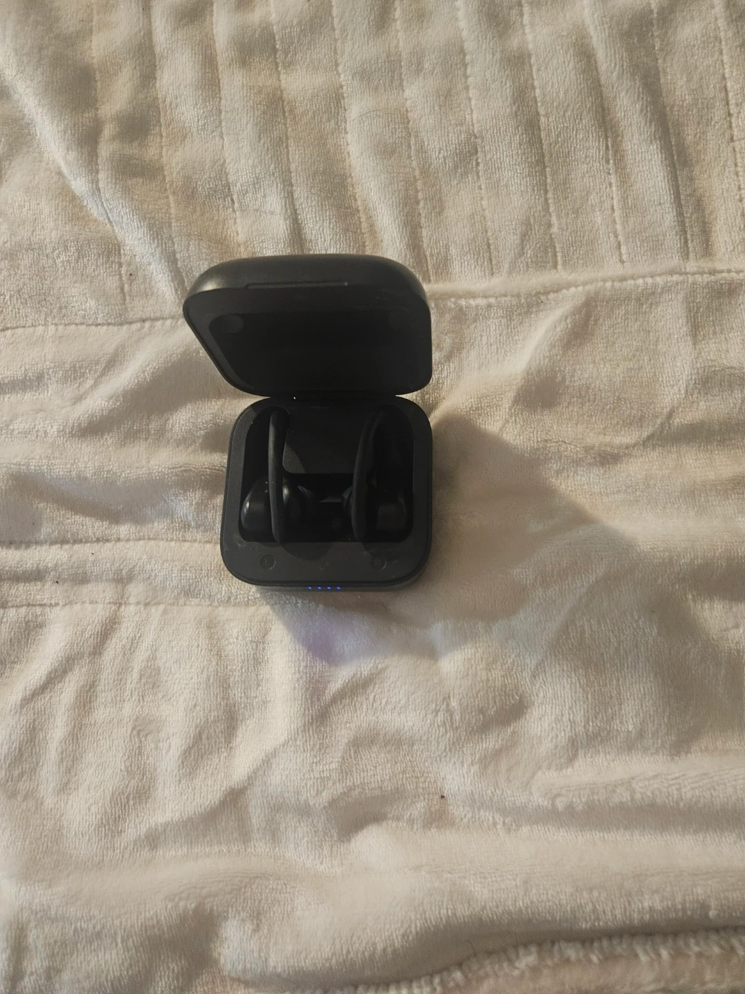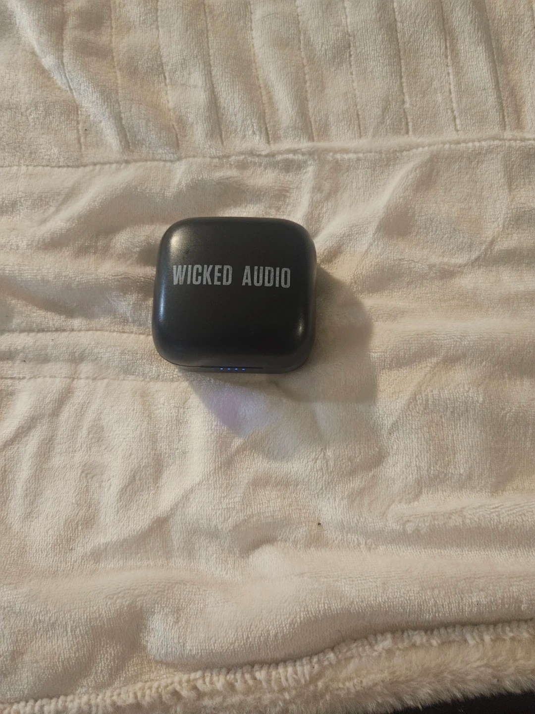 Wicked Audio wireless earbuds with charging case. Black colour. These earbuds offer a secure fit for active use. They're great for on-the-go listening!