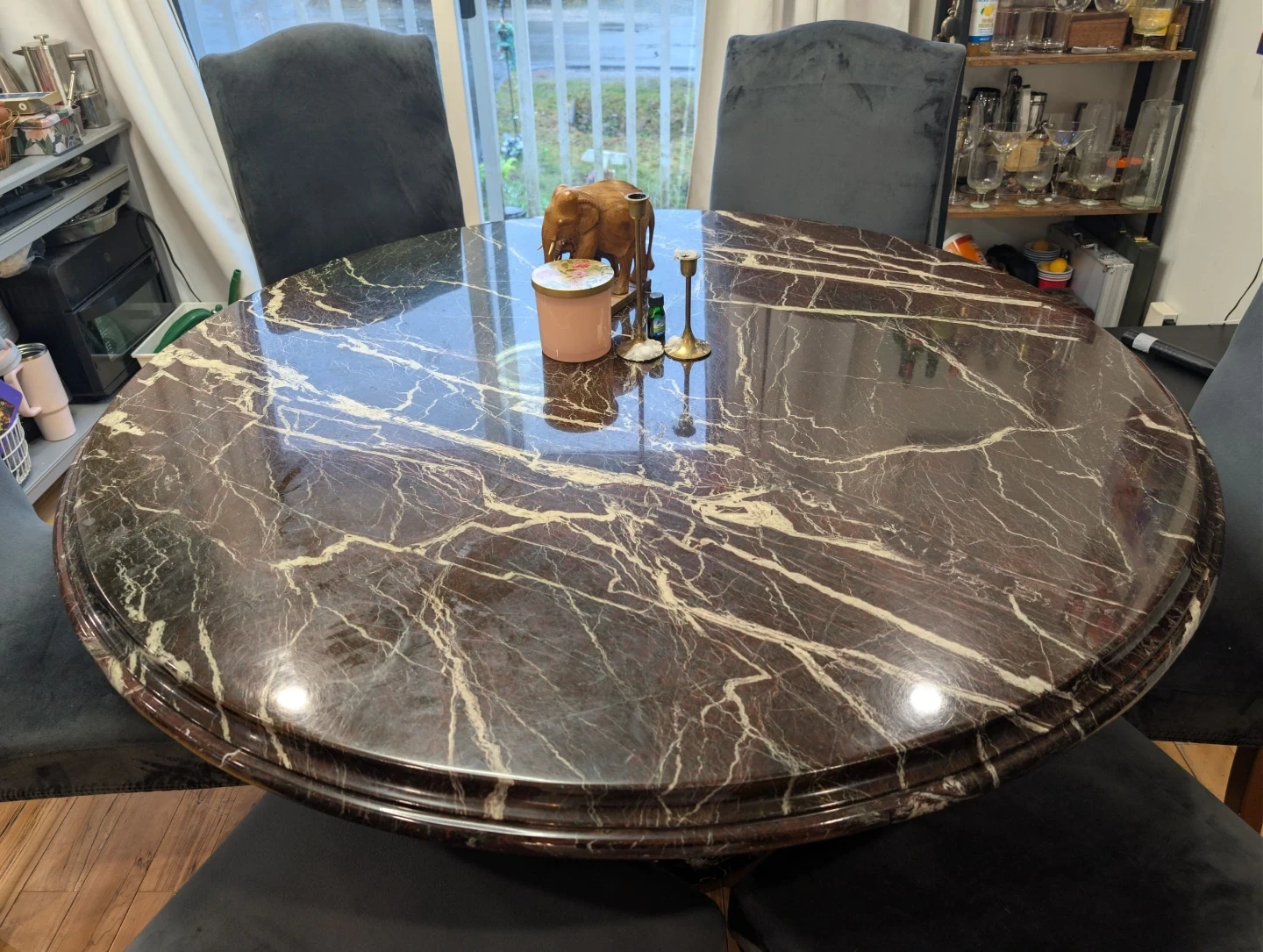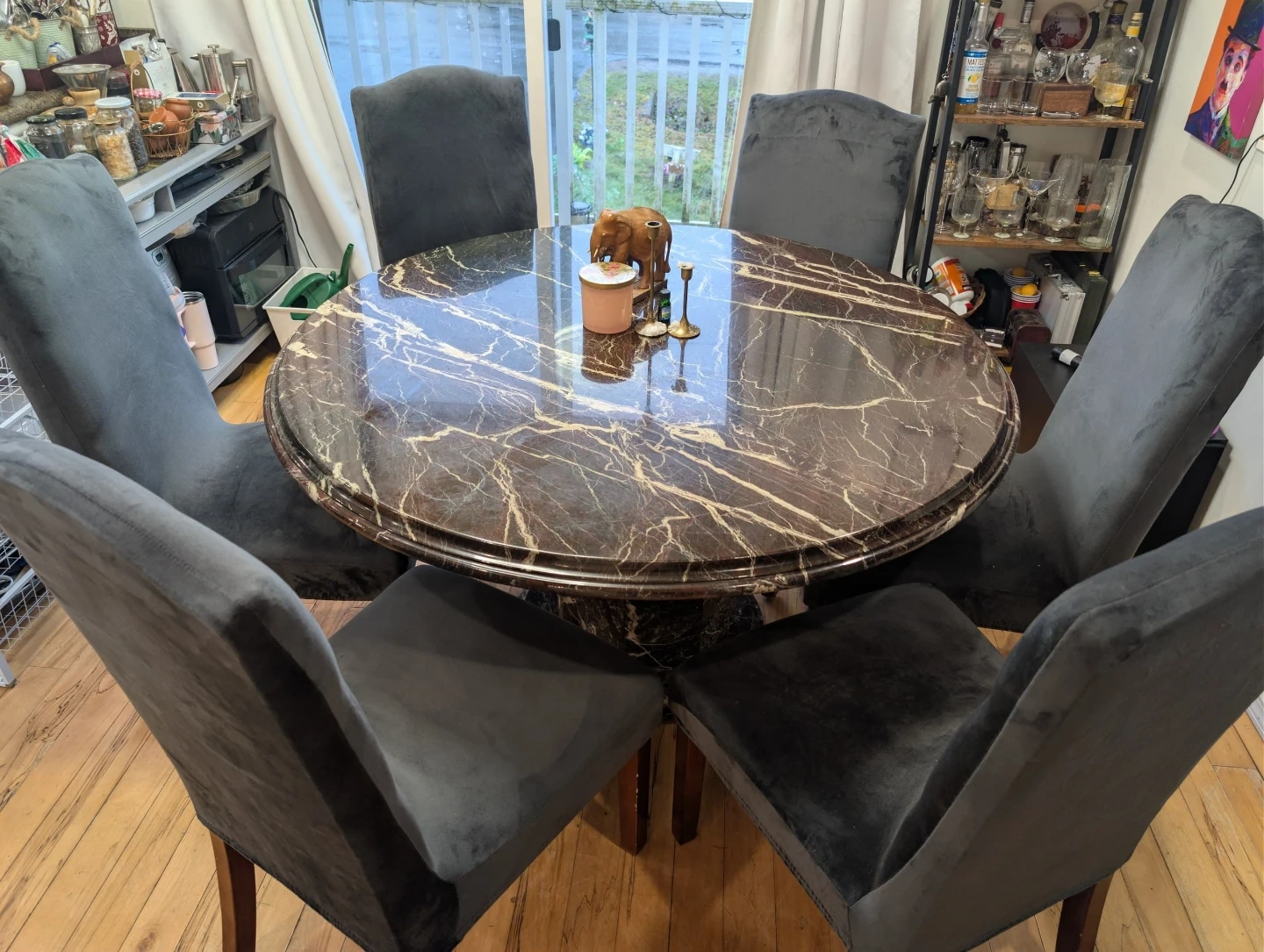 Marble-look round dining table with a pedestal base. It comes with six dark grey velvet upholstered dining chairs, you can change the chair covers to your liking. This set's suitable for family dinners or entertaining guests.