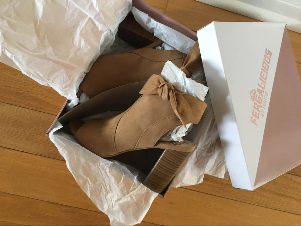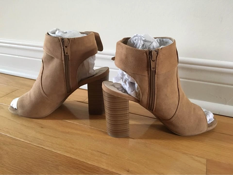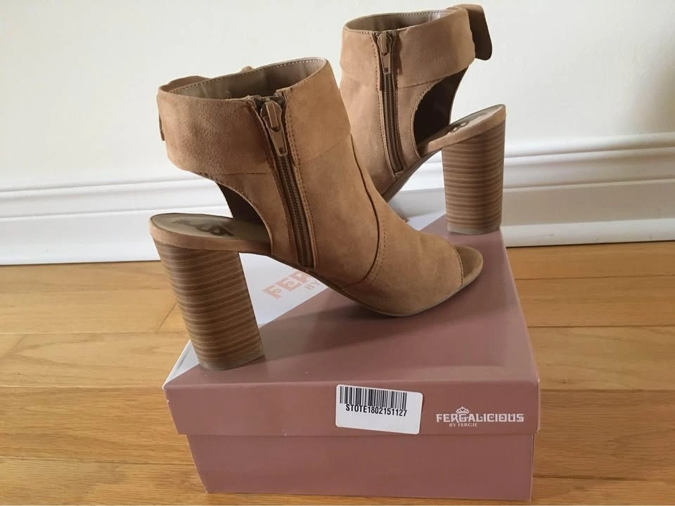 Like New Fergalicious by Fergie booties/sandals in Size 8, Medium Width. Fits size 7.5 - 8. Very fashion forward! Worn once indoors but too high for me unfortunately. Features latte/light tan colour faux suede with peep toe, 3.5 inches block heel and cushioned traction outsole, pretty stylish bow and side zipper. Comes in original box. Paid $90 plus tax. Please see photos. If it’s listed it’s available. Feel free to view my other listings for more shoes and sandals! Pick up at Warden and Highway 7 in Markham.