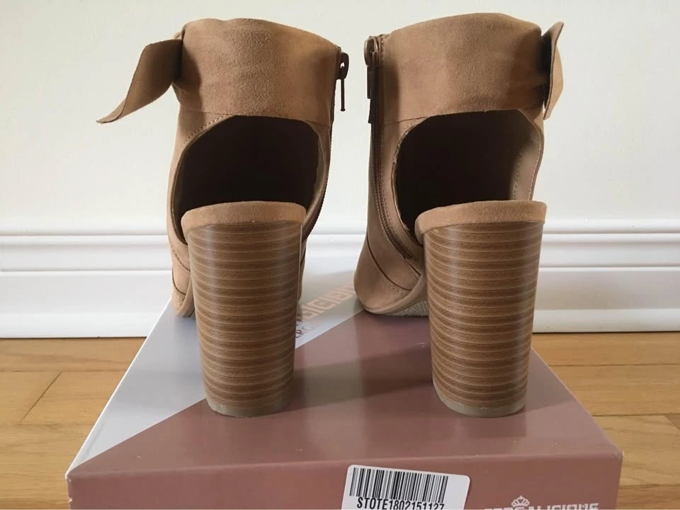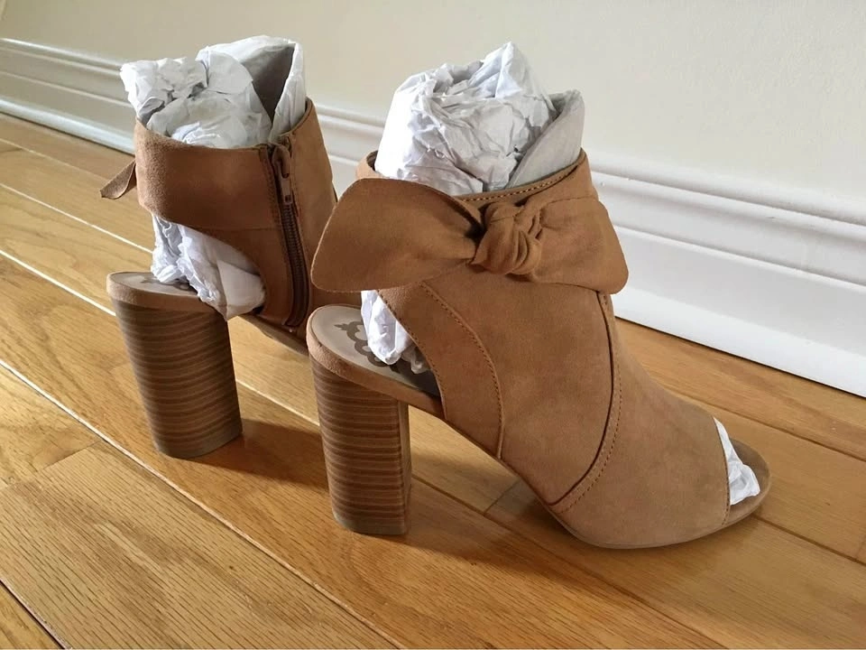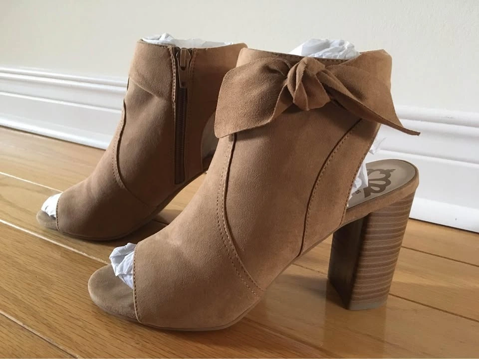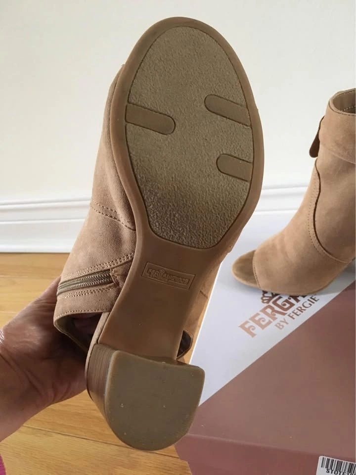 Like New Fergalicious by Fergie booties/sandals in Size 8, Medium Width. Fits size 7.5 - 8. Very fashion forward! Worn once indoors but too high for me unfortunately. Features latte/light tan colour faux suede with peep toe, 3.5 inches block heel and cushioned traction outsole, pretty stylish bow and side zipper. Comes in original box. Paid $90 plus tax. Please see photos. If it’s listed it’s available. Feel free to view my other listings for more shoes and sandals! Pick up at Warden and Highway 7 in Markham.