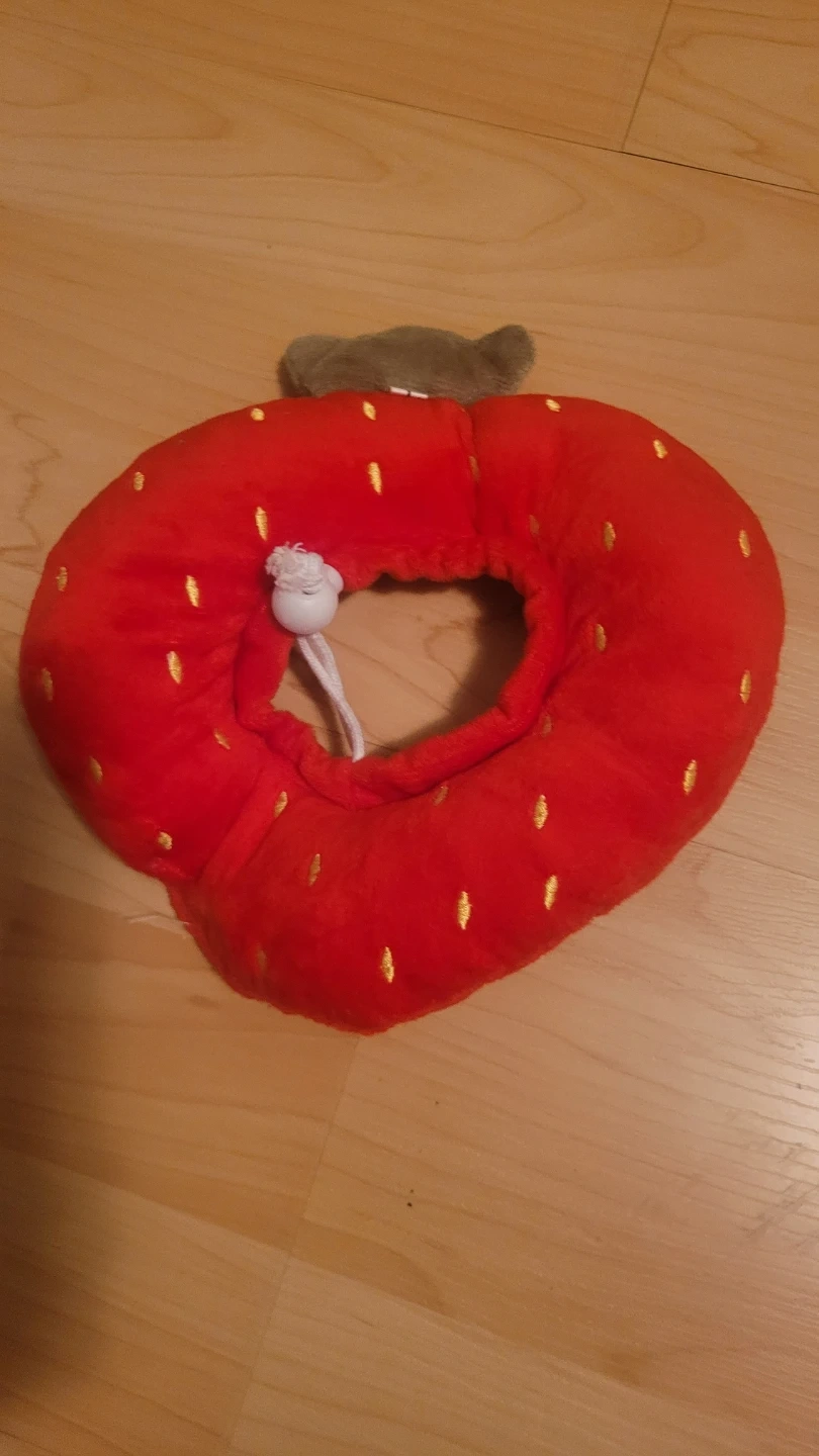 Cute strawberry-shaped pet recovery collar. It's soft and plush to keep your pet comfortable while it heals. The adjustable drawstring ensures a snug fit.