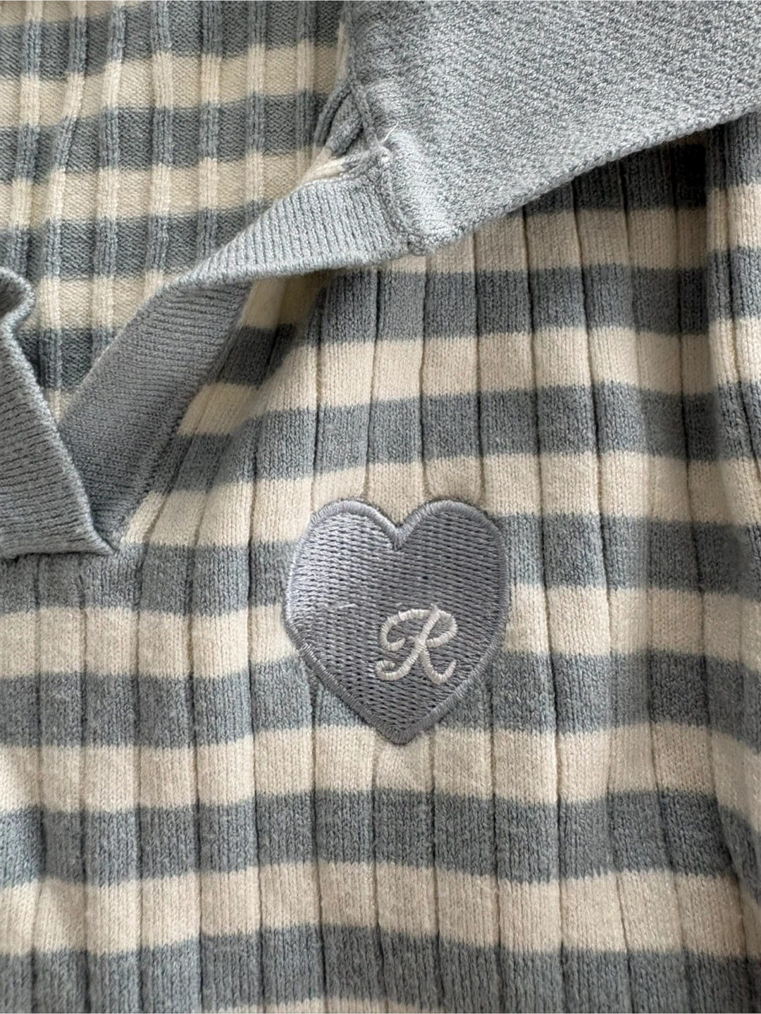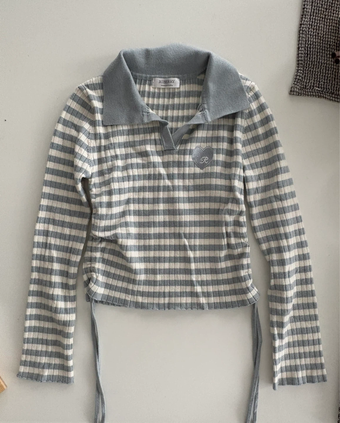 A cute ribbed long-sleeve shirt featuring a light blue and white stripe pattern. It has a collared neckline and adjustable tie details at the sides. Soft and stretchy. Fits S/XS. Perfect condition.