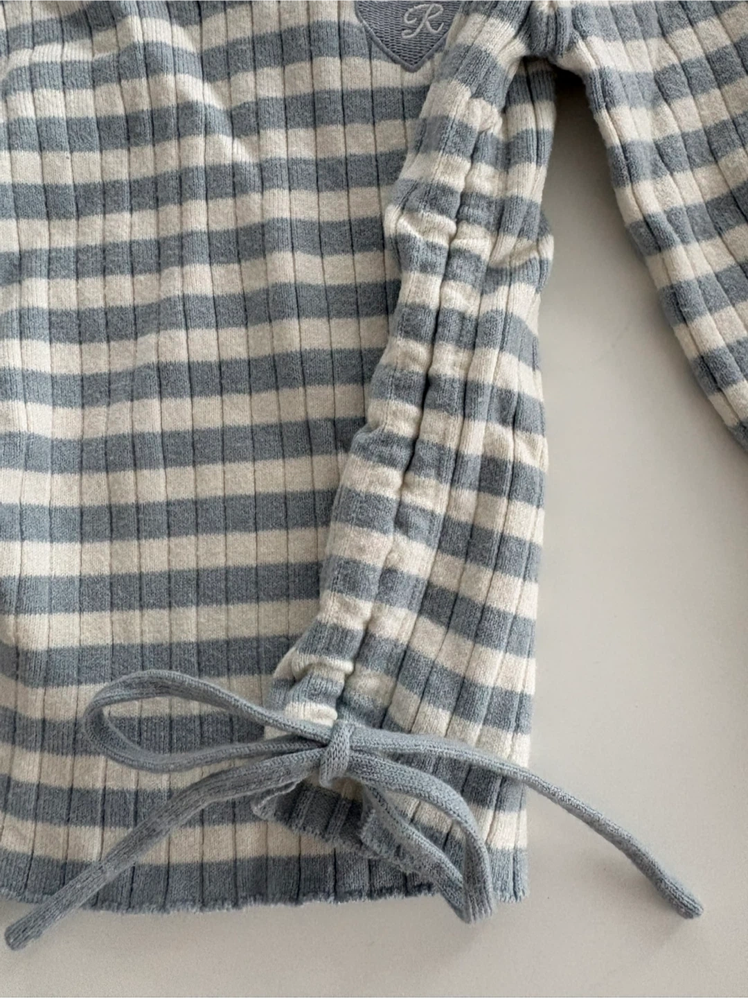 A cute ribbed long-sleeve shirt featuring a light blue and white stripe pattern. It has a collared neckline and adjustable tie details at the sides. Soft and stretchy. Fits S/XS. Perfect condition.