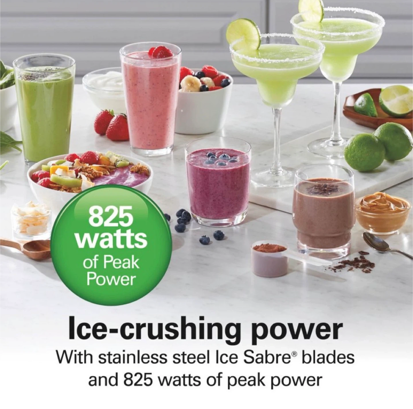 This Hamilton Beach blender offers 12 functions for maximum blending versatility. It features a shatter-resistant 48 oz. glass jar and 825 watts of peak power with stainless steel Ice Sabre blades. The jar is BPA-free in food zones and dishwasher safe.