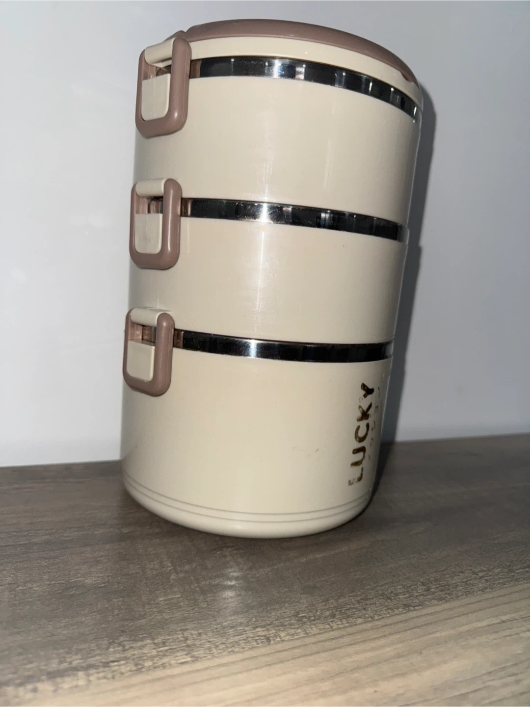 Here's a Lucky brand 3-tier lunch box! It's in great shape and ready for your delicious meals. The containers are stainless steel, so they're easy to clean and keep your food fresh