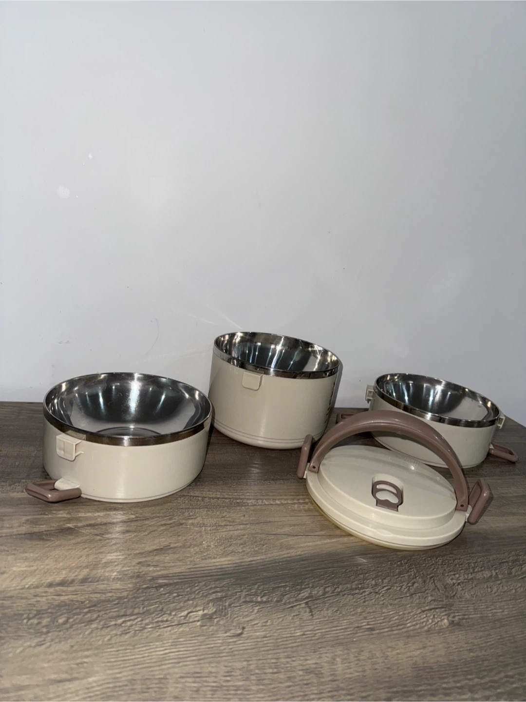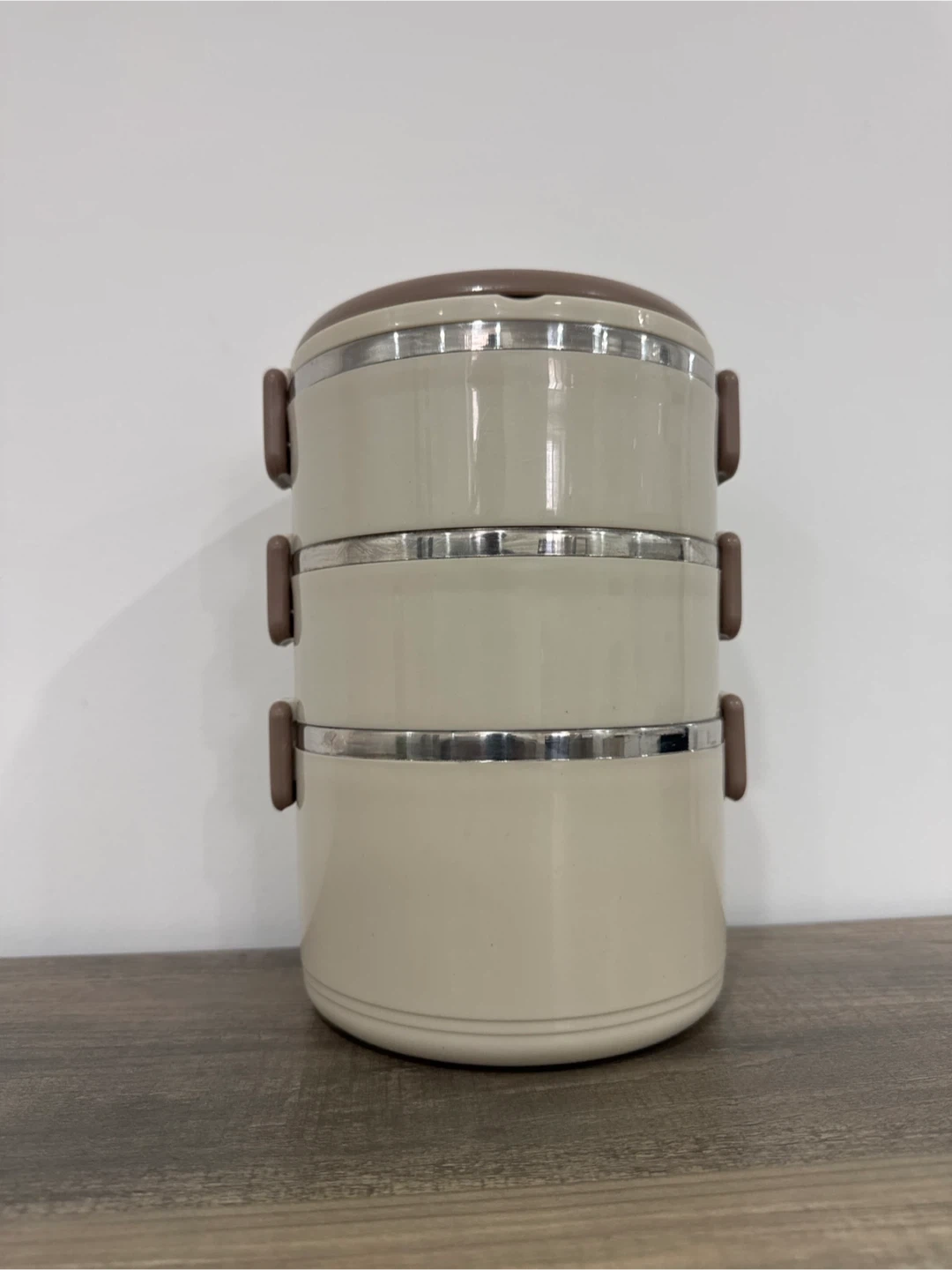 Here's a Lucky brand 3-tier lunch box! It's in great shape and ready for your delicious meals. The containers are stainless steel, so they're easy to clean and keep your food fresh
